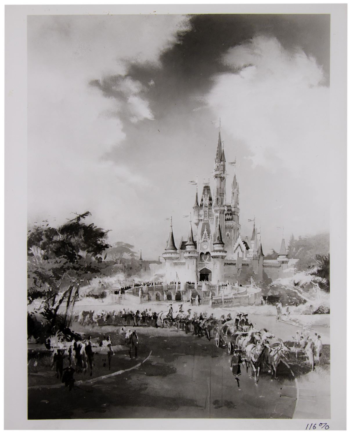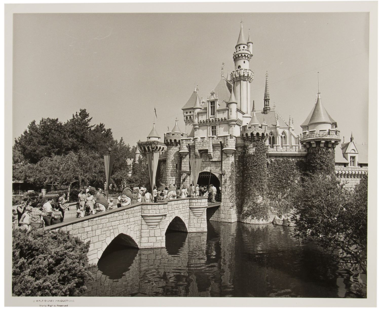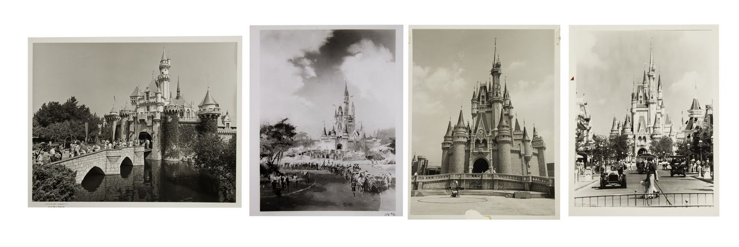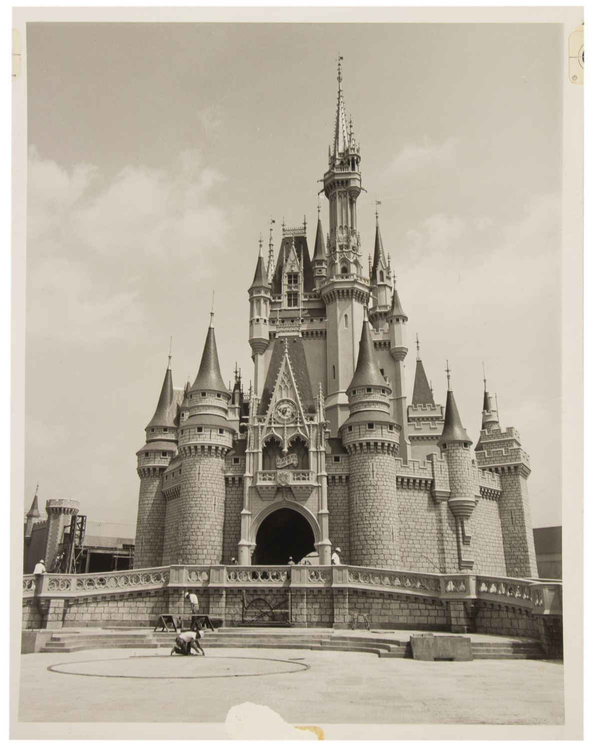 (Walt Disney World, 1971) A set of (4) black and white publicity photos featuring "Sleeping Beauty Castle" and "Cinderella Castle", created to promote both Disneyland and Walt Disney World. This set includes one photo of "Sleeping Beauty Castle", and three photos of "Cinderella Castle" including its concept art, construction, and opening. The concept art photo has information for publicity purposes listed on the back, and the construction photo has a Disney copyright stamp on the back. The photos measure approximately 8"x10" each, and the set is in overall good condition with some edge-wear to two of the photos from use.