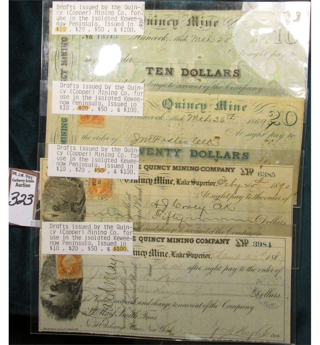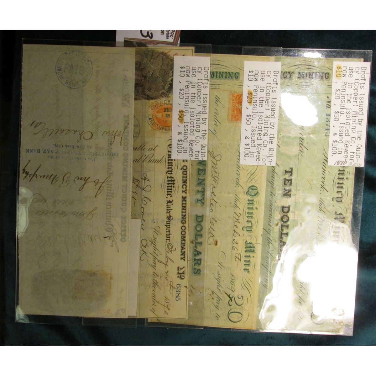 Set of (4)Drafts issued by the Quincy (Copper) Mining Co. for use in the isolated Keweenaw, Peninsula, Issued in $10, $20, $50, & $100. 'Doc' originally valued the set at $260.00.