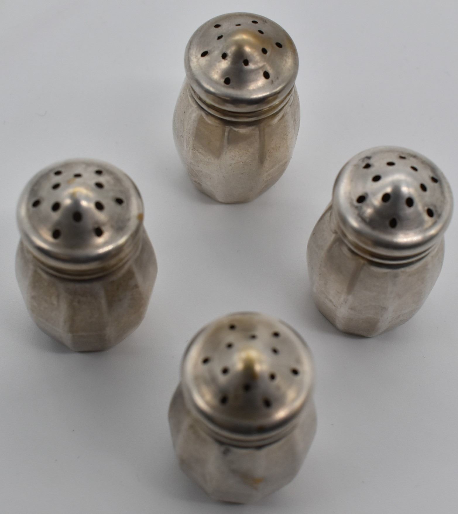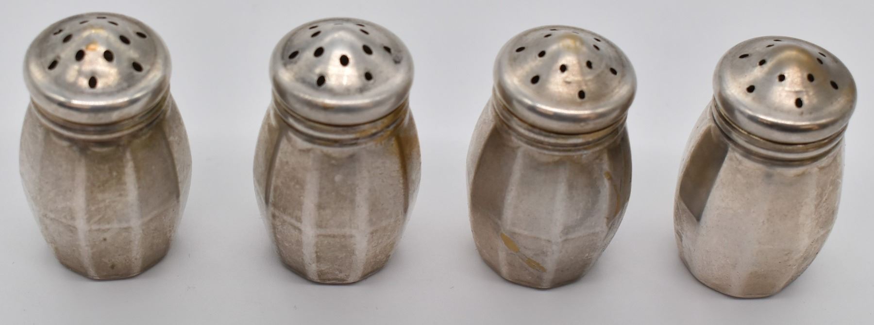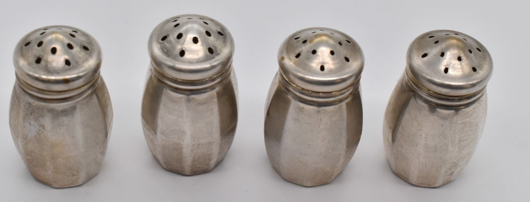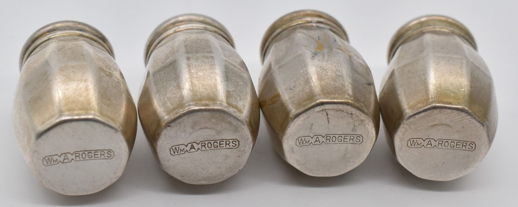 Set of 4 Estate Antique Wm. & Rogers Salt and Pepper Shakers, largest measures 1.25''H x 1''W, marked on the bottom