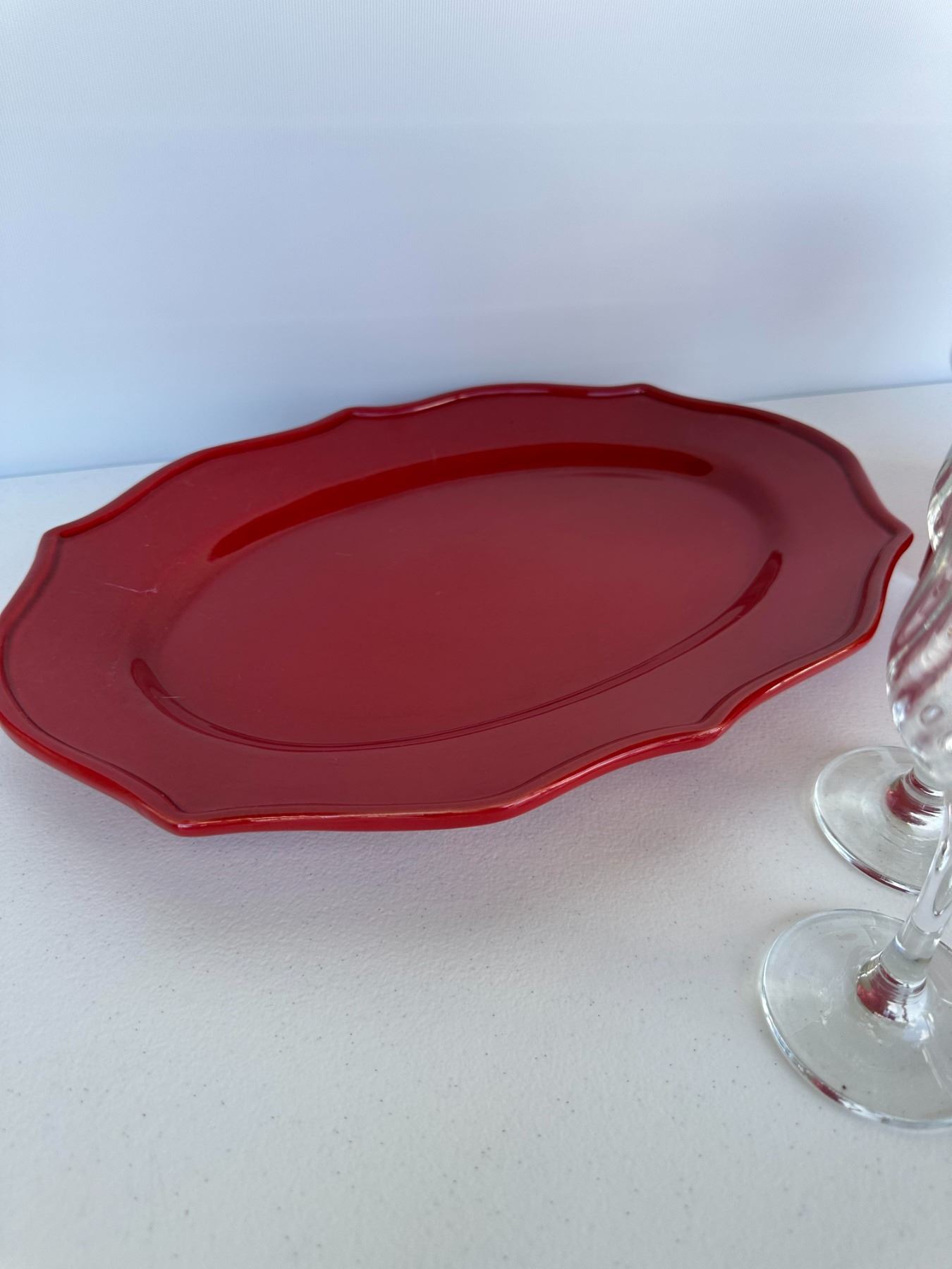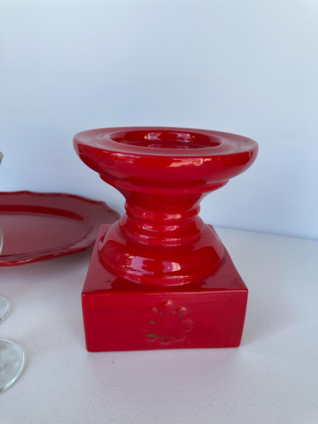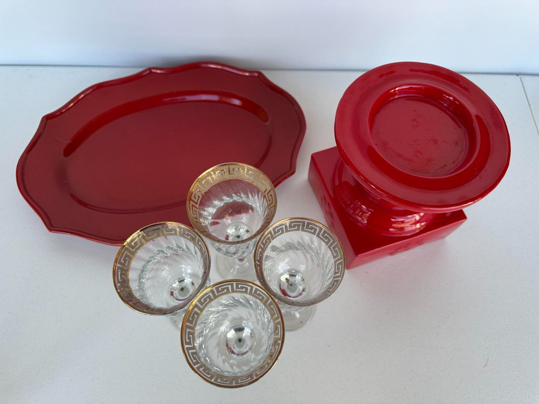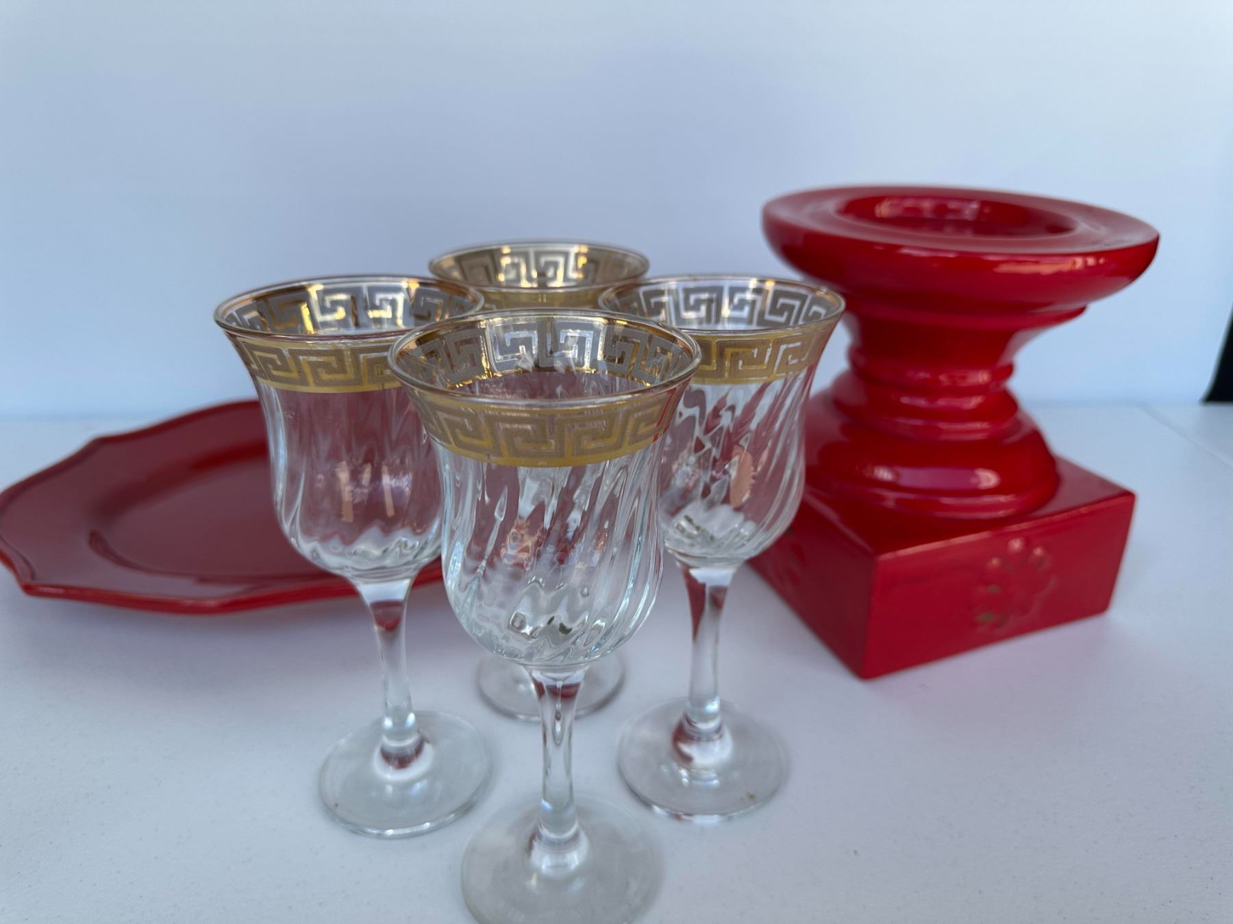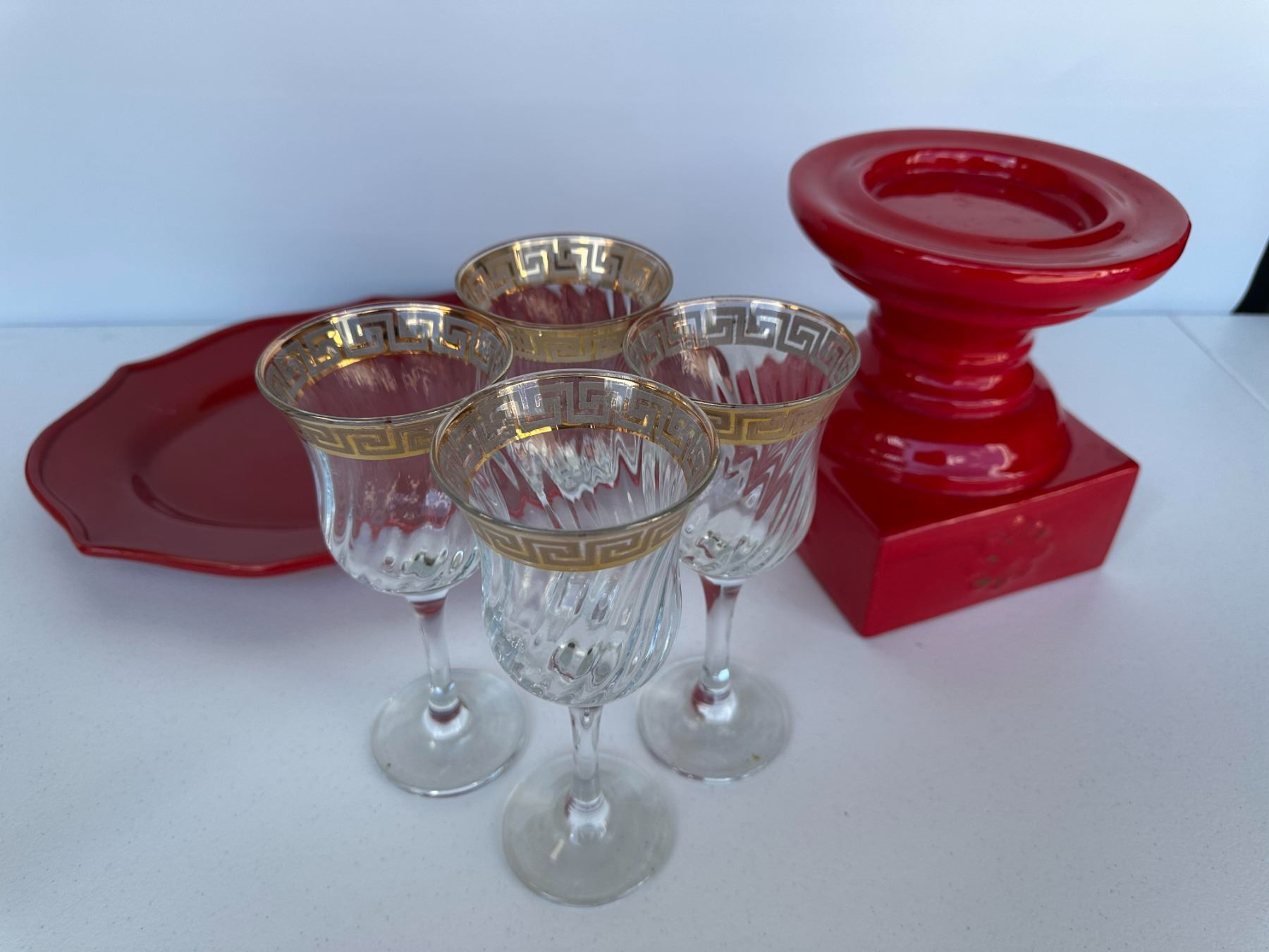 Elegant set of four clear goblets with ornate gold Greek key rims, plus red pedestal candleholder and serving plate. Striking vintage inspired barware set.