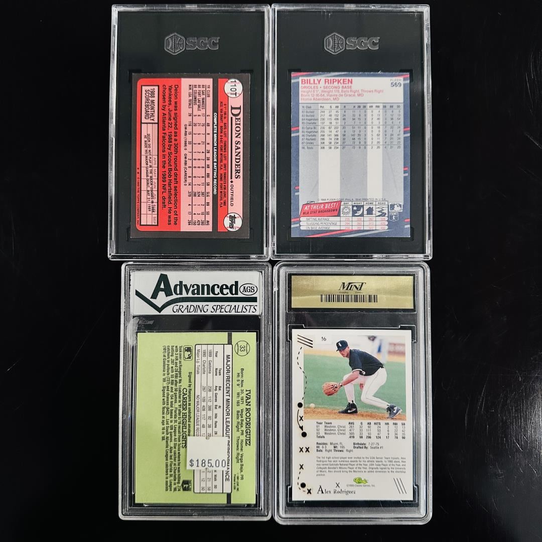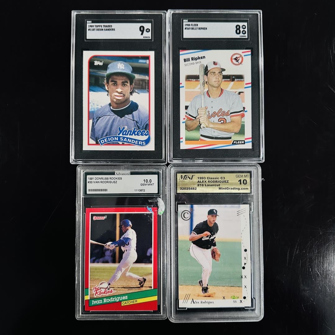 This four-card lot features stars and rookies from the late 1980s and early 1990s. Included are a 1989 Topps Traded #110T Deion Sanders graded SGC 9 and a 1989 Fleer #569 Billy Ripken graded SGC 8.8. Also included are a 1991 Donruss Rookies #3 Ivan Rodriguez graded AGS 10.0 GEM MINT and a 1993 Classic C3 Alex Rodriguez #16 Lasershot graded GEM MT 10 by Mint Grading. A strong mix of multi-sport icons and baseball legends in top condition.