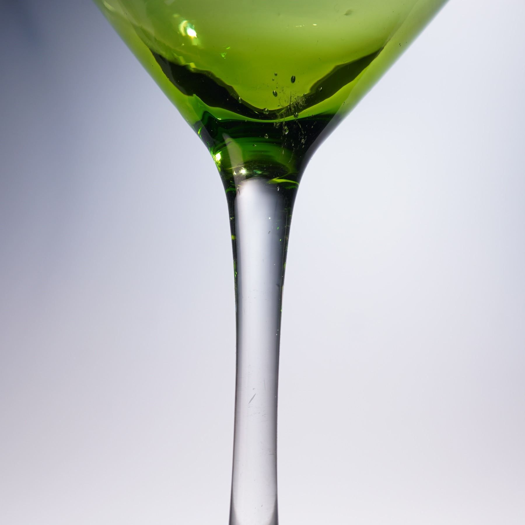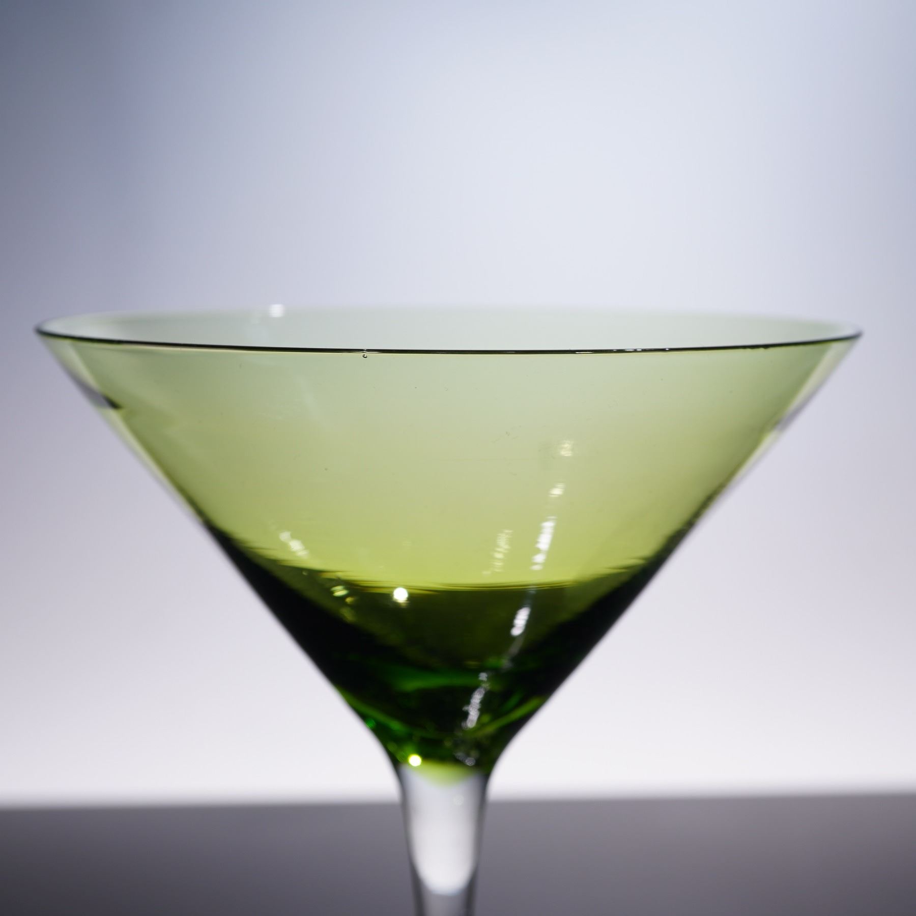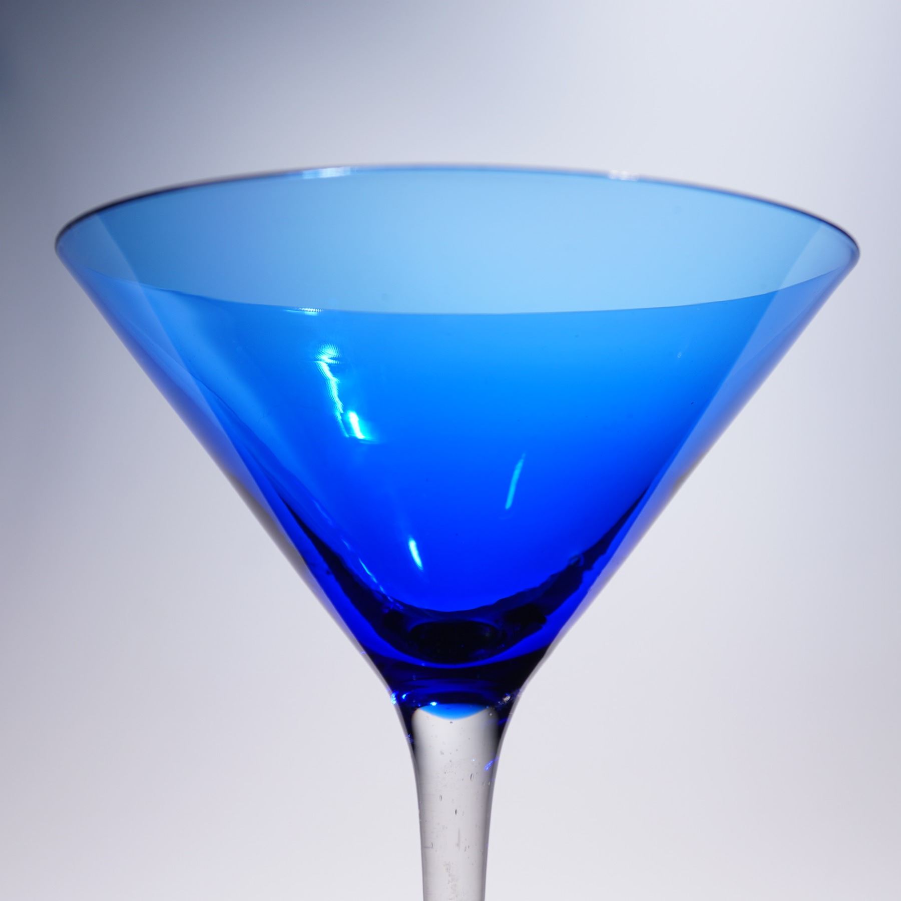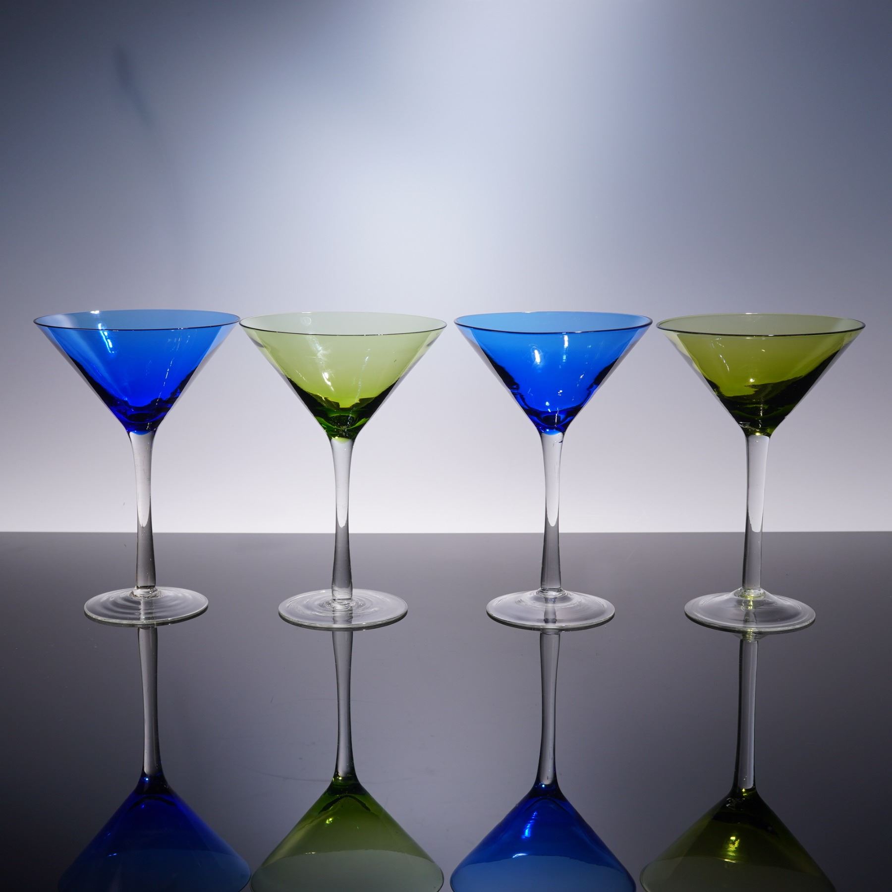 A striking set of four hand-blown cocktail glasses featuring two in cobalt blue and two in olive green. Each glass showcases a classic martini silhouette with a clear stem and base, allowing the rich bowl colors to stand out. Elegant and modern, these glasses are perfect for entertaining or display. Each measures 7"H.