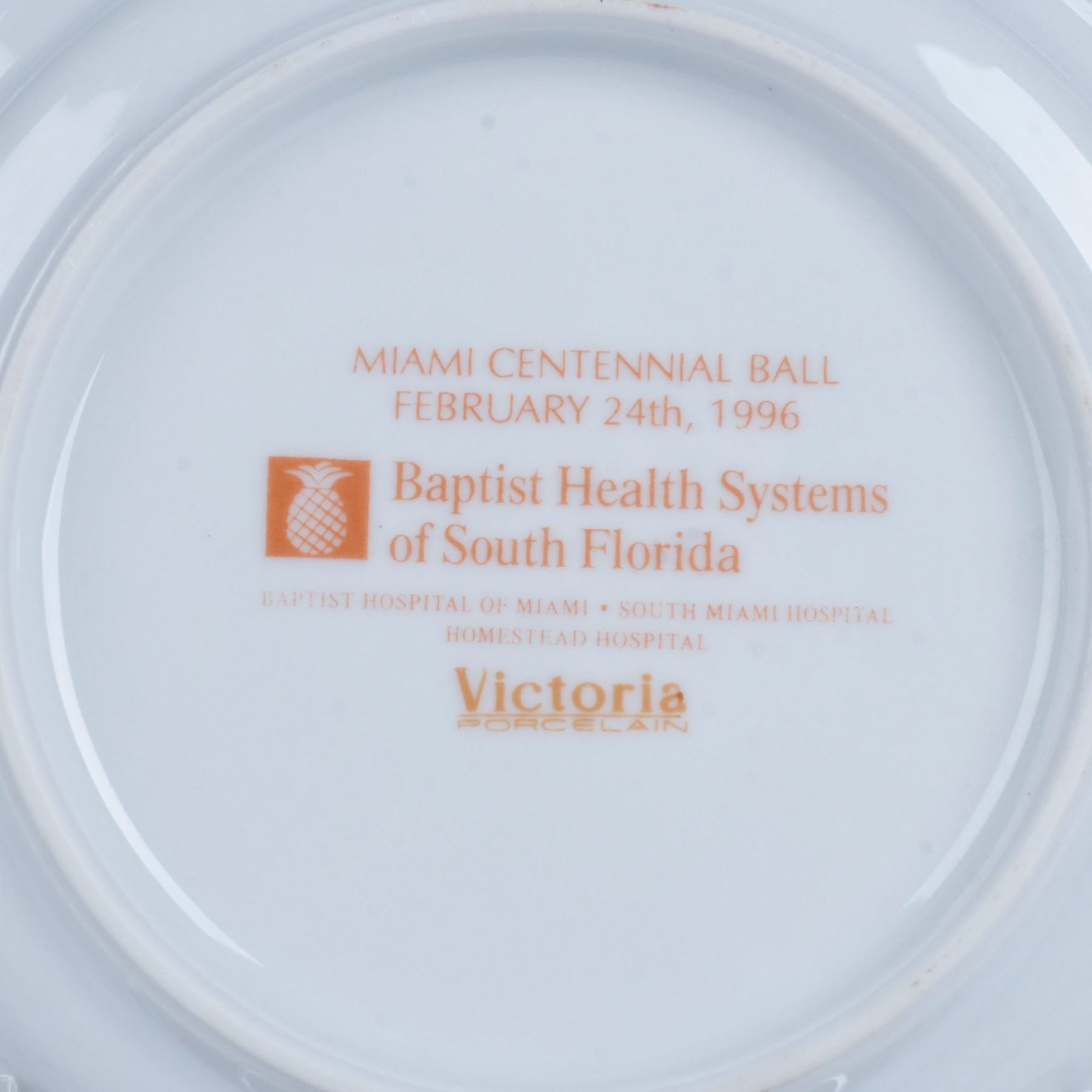Four charming dessert plates featuring a pink floral border with a gilt rim and the vintage Royal Palm Hotel logo at the center. Miami Centennial Ball and date on the back. Victoria Porcelain backstamp.