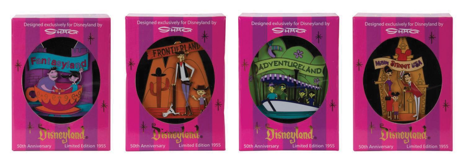 (Disneyland, 2005) A set of (4) limited edition Jumbo pins designed by Shag for the 50th anniversary of Disneyland. The pins of this set are limited to an edition of 1,955, and highlights Main Street, Adventureland, Frontierland, and Fantasyland. Measuring various sizes, each fine condition pin retains original Disney Parks pinbacks, and is displayed in its original window box with artist bio. Measuring 5.5"x4" and 1.5" deep, each candy-striped box is in fine condition with very minor indents, edge wear, and cornering.