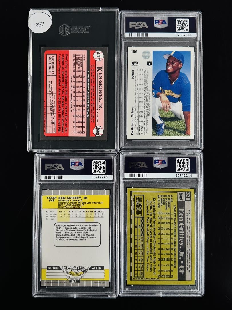 This four-card lot highlights Ken Griffey Jr. with early career releases from Topps, Upper Deck, and Fleer. It includes a 1989 Topps Traded #41T graded SGC 9, a 1990 Upper Deck #156 graded PSA 6, and two PSA 8 cards: 1989 Fleer #548 and 1990 Topps #336. A clean and collectible set representing one of the most iconic players of his era.