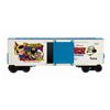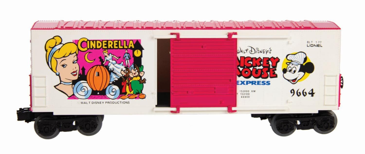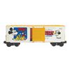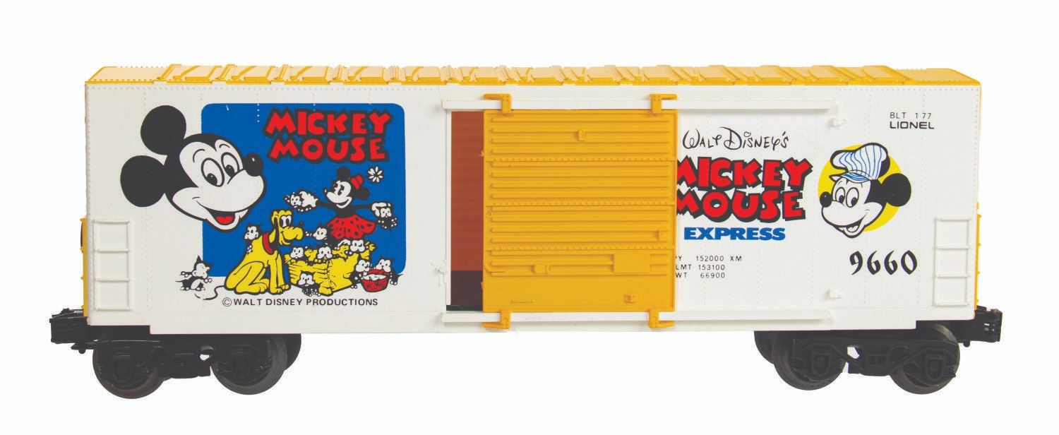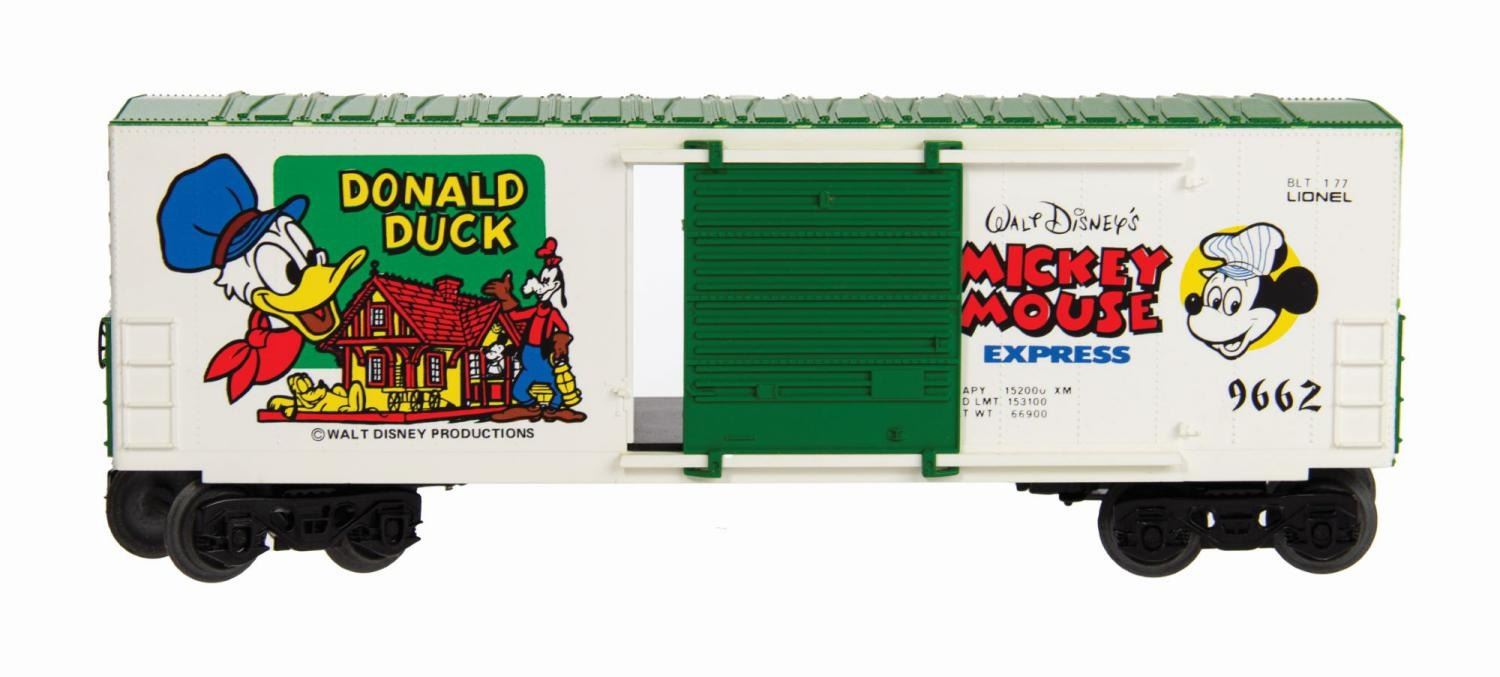 (Lionel, 1977) A collection of (4) Mickey Mouse Express train cars by Lionel. Composed of plastic with metal wheels, each with plastic sliding doors on both sides of the car, all are in their original boxes measuring 5"x12" and 2.5" deep. The cars are in fine unused condition with minimal wear. The boxes are in fair to good condition, with some small tears throughout.
