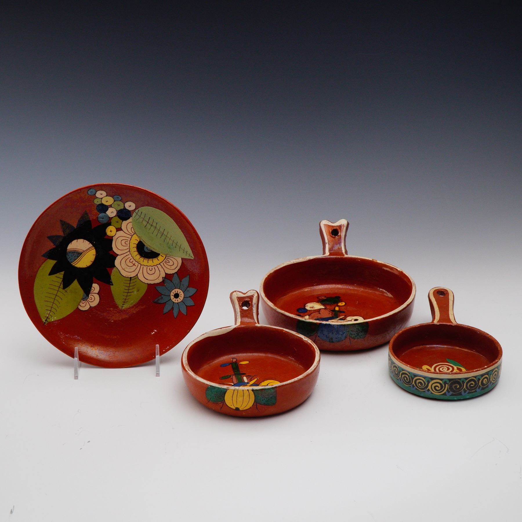 Set of 4 Mexican Redware Pottery Hand Painted Dishes