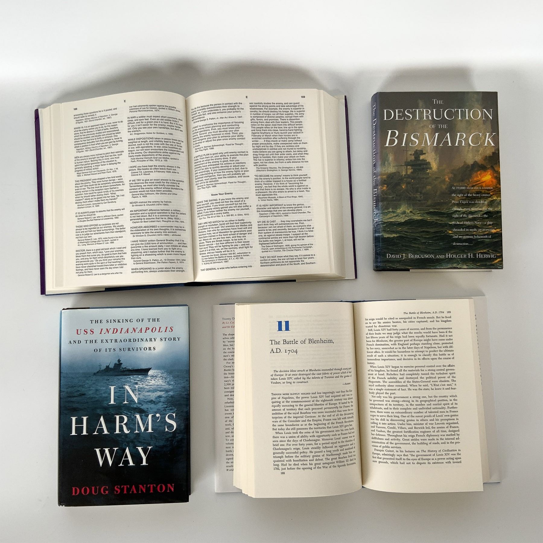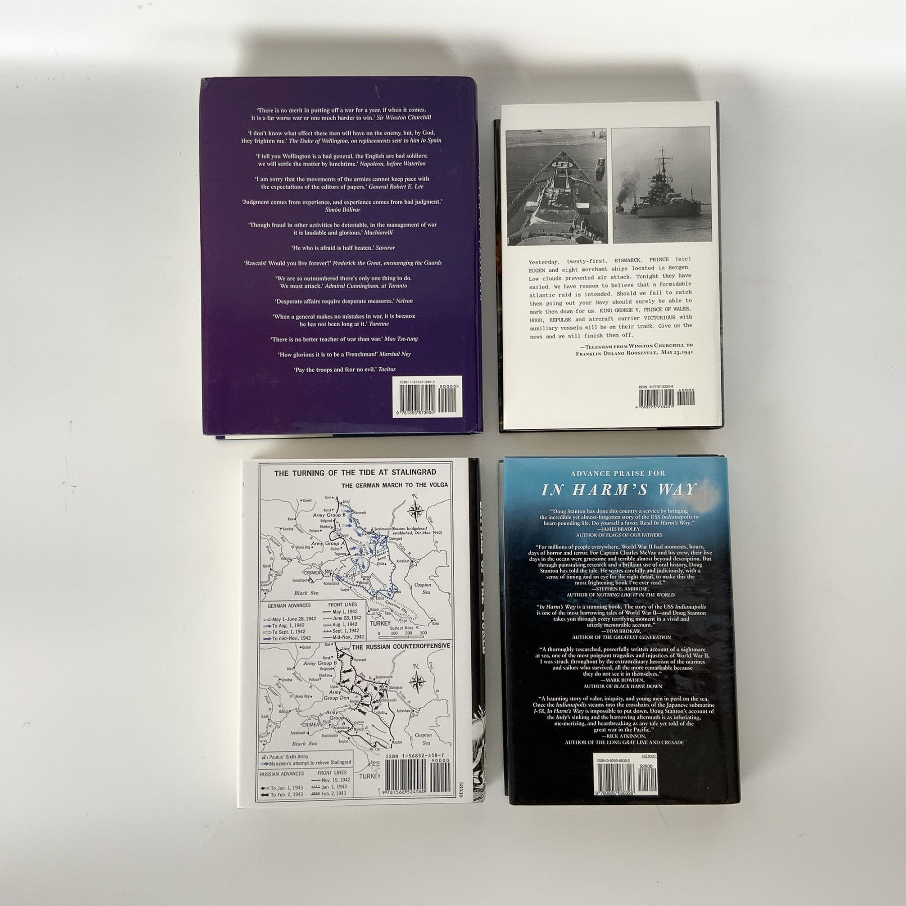 This collection includes four hardcover books covering significant military history, strategy, and firsthand accounts of wartime events. Twenty Decisive Battles of the World explores key battles that shaped history, providing detailed analysis of strategic decisions. The Greenhill Dictionary of Military Quotations by Peter G. Tsouras is a comprehensive reference work featuring notable quotes from military leaders and historians. In Harm's Way by Doug Stanton recounts the dramatic true story of the USS Indianapolis disaster and its survivors. The Destruction of the Bismarck by David J. Bercuson and Holger H. Herwig presents an in-depth narrative of the legendary World War II naval battle that led to the sinking of Germany's most powerful battleship. A must-have set for military history enthusiasts, researchers, or collectors of war literature.