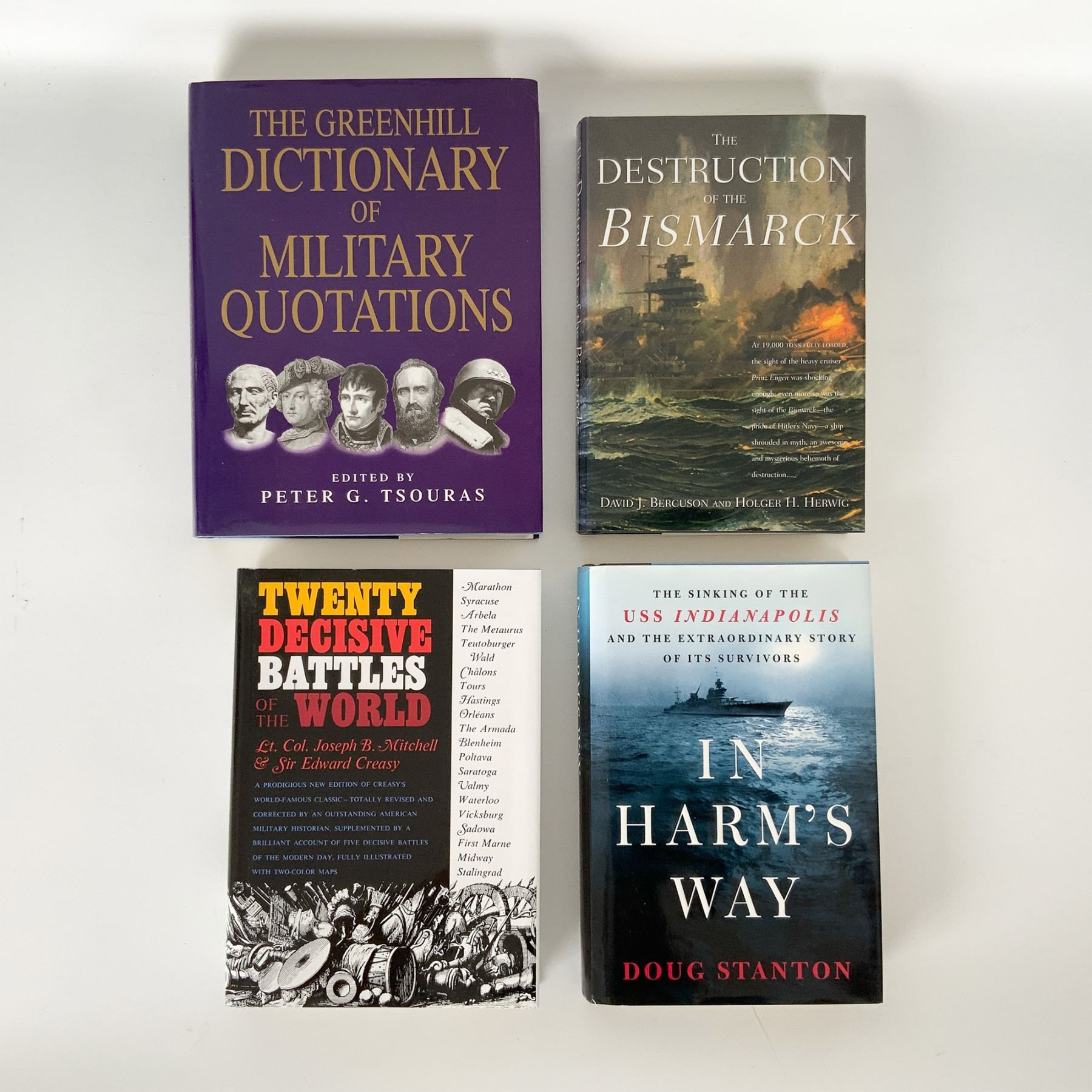 This collection includes four hardcover books covering significant military history, strategy, and firsthand accounts of wartime events. Twenty Decisive Battles of the World explores key battles that shaped history, providing detailed analysis of strategic decisions. The Greenhill Dictionary of Military Quotations by Peter G. Tsouras is a comprehensive reference work featuring notable quotes from military leaders and historians. In Harm's Way by Doug Stanton recounts the dramatic true story of the USS Indianapolis disaster and its survivors. The Destruction of the Bismarck by David J. Bercuson and Holger H. Herwig presents an in-depth narrative of the legendary World War II naval battle that led to the sinking of Germany's most powerful battleship. A must-have set for military history enthusiasts, researchers, or collectors of war literature.