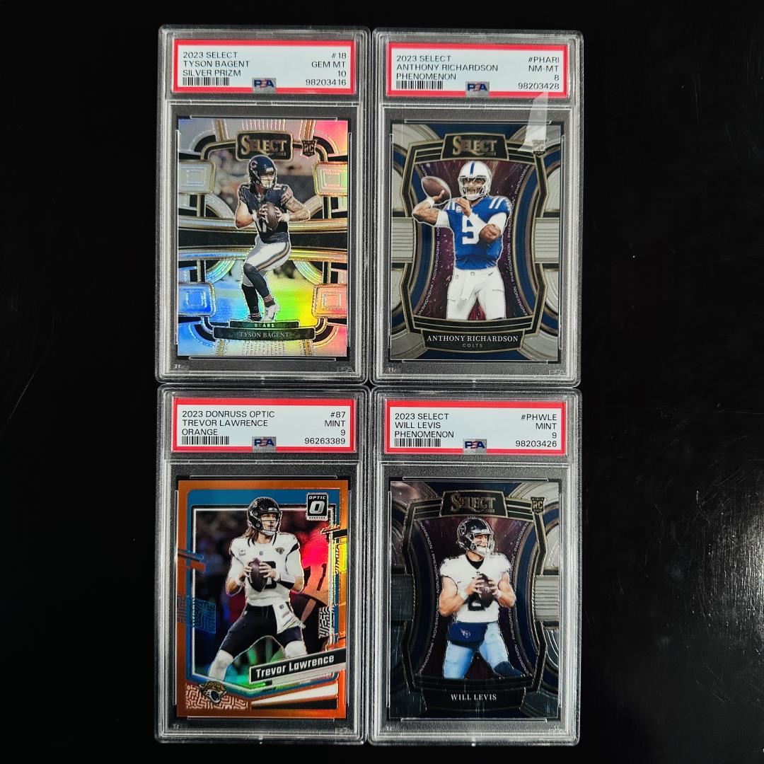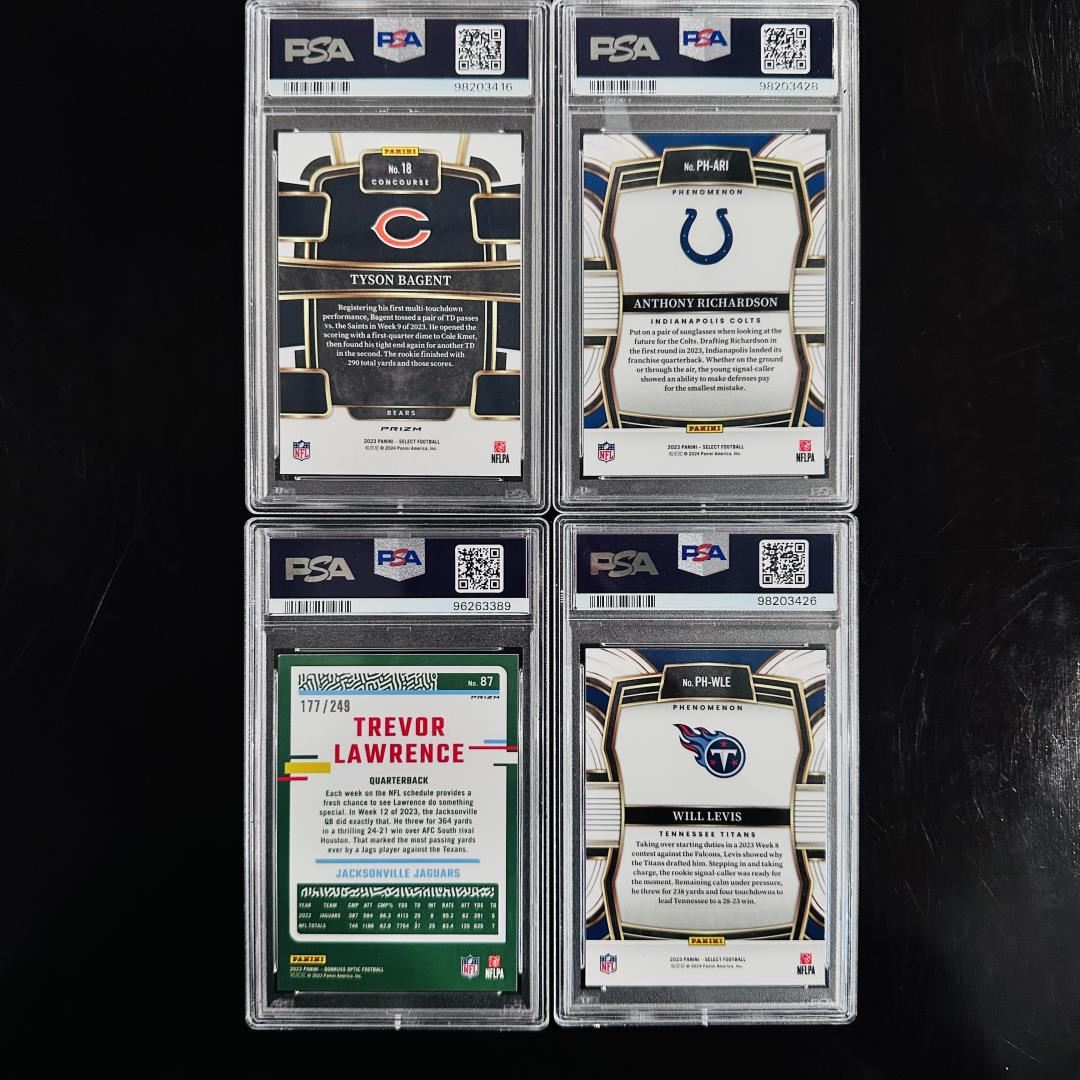 This four-card lot features top quarterback talent with sharp PSA-graded modern releases. Included are a 2023 Select Tyson Bagent Silver Prizm graded PSA 10 GEM MT, a 2023 Select Anthony Richardson Phenomenon insert graded PSA 8, a 2023 Select Will Levis Phenomenon insert graded PSA 9, and a 2023 Donruss Optic Orange Trevor Lawrence #87 serial-numbered 177/249 graded PSA 9. These cards showcase both established and emerging NFL QBs, highlighted by strong parallels and inserts. A high-grade, visually striking group ideal for collectors of quarterback rookies and stars.