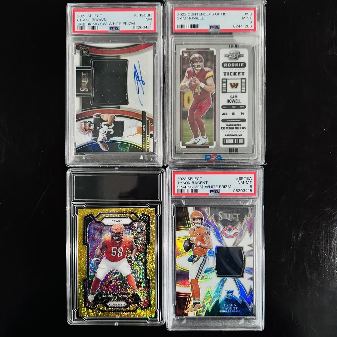 This four-card lot features rookie cards from rising NFL talents, each graded by PSA. Included are a 2023 Select White Prizm Jumbo Rookie Signature Patch of Chase Brown (PSA NM), a 2022 Contenders Optic Sam Howell Rookie Ticket (PSA 9 Mint), a 2023 Select Sparks Memorabilia White Prizm of Tyson Bagent (PSA 8 NM-MT), and a 2023 Prizm Darrell Wright Disco Prizm Rookie (ungraded). The Bagent and Brown cards each include jersey patches, with Brown also featuring an autograph. A standout mix of modern rookie hits with grading and memorabilia appeal.