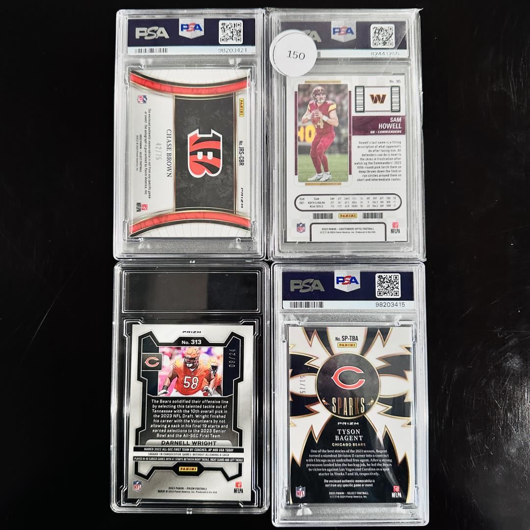 This four-card lot features rookie cards from rising NFL talents, each graded by PSA. Included are a 2023 Select White Prizm Jumbo Rookie Signature Patch of Chase Brown (PSA NM), a 2022 Contenders Optic Sam Howell Rookie Ticket (PSA 9 Mint), a 2023 Select Sparks Memorabilia White Prizm of Tyson Bagent (PSA 8 NM-MT), and a 2023 Prizm Darrell Wright Disco Prizm Rookie (ungraded). The Bagent and Brown cards each include jersey patches, with Brown also featuring an autograph. A standout mix of modern rookie hits with grading and memorabilia appeal.