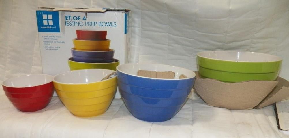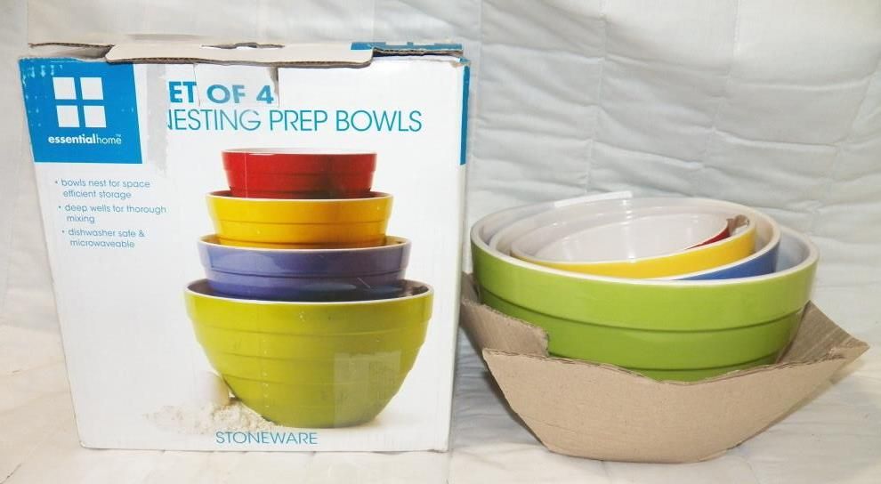 Essential Home Nesting Bowls 4-Piece Nesting Mixing Bowls Set includes four assorted size mixing bowls that can be easily nested when not in use for storage. Bowls measure 6 1/2" to 9 1/4" diameter.