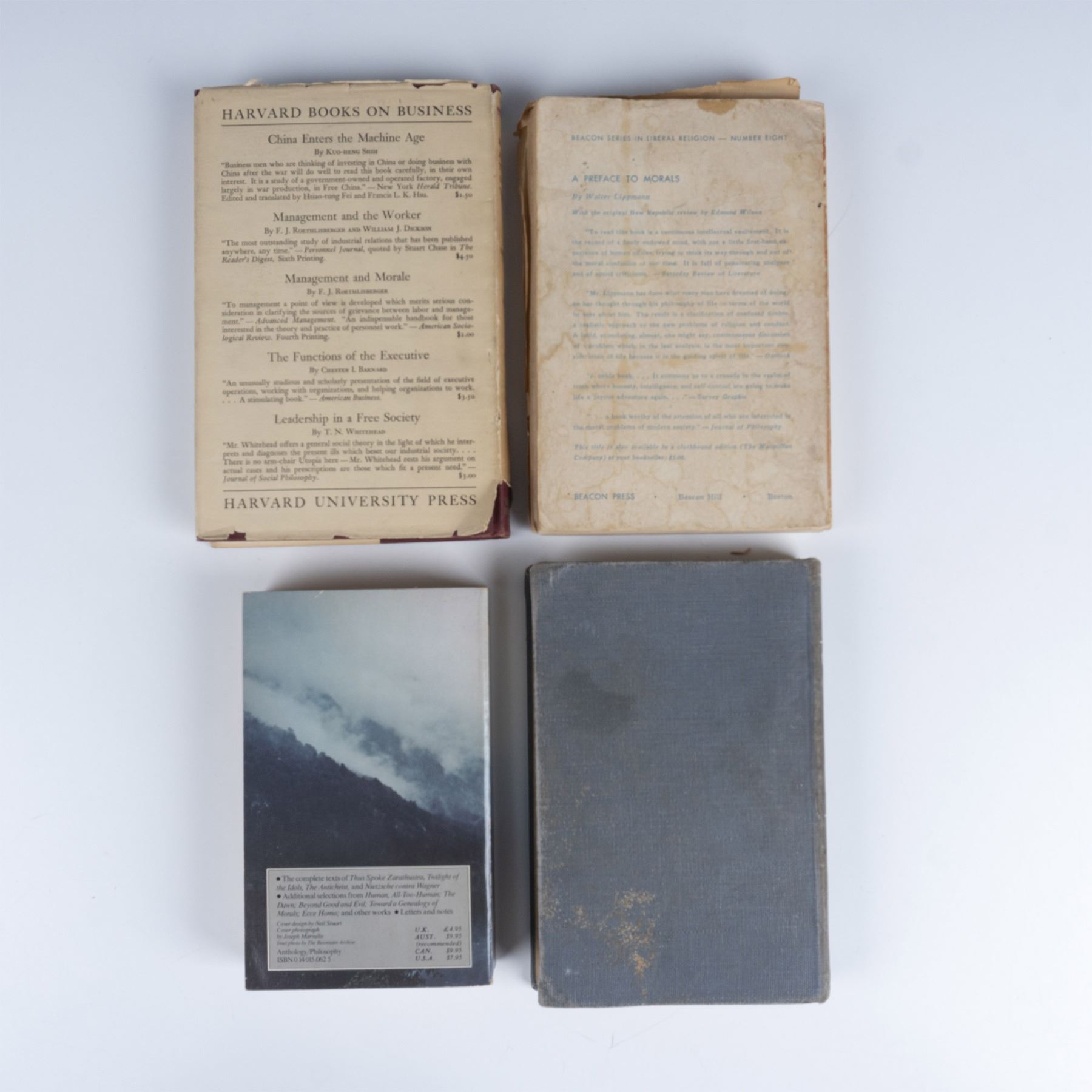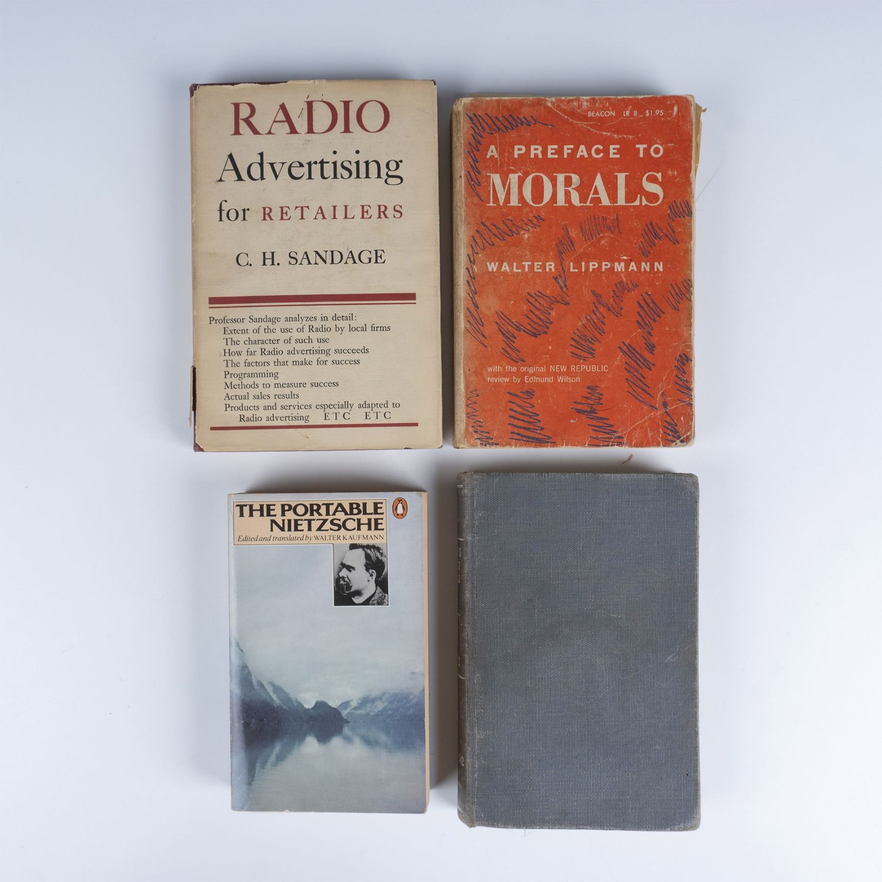 Titles include: The Portable Nietzsche edited by Walter Kaufman (1982); Radio Advertising for Retailers by C.H. Sandage (1945); A Preface to Morals by Walter Lippman (1965); Where is your War by Pyle (1943). The dimensions of the collection measures: 5.75''L x 4.5''W x 8.75''H.