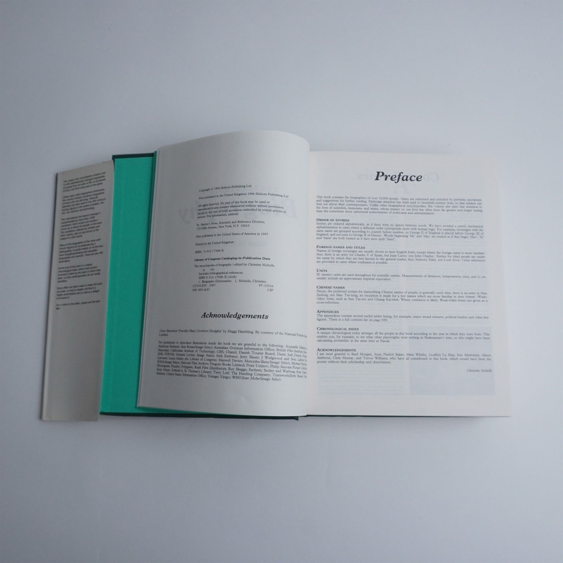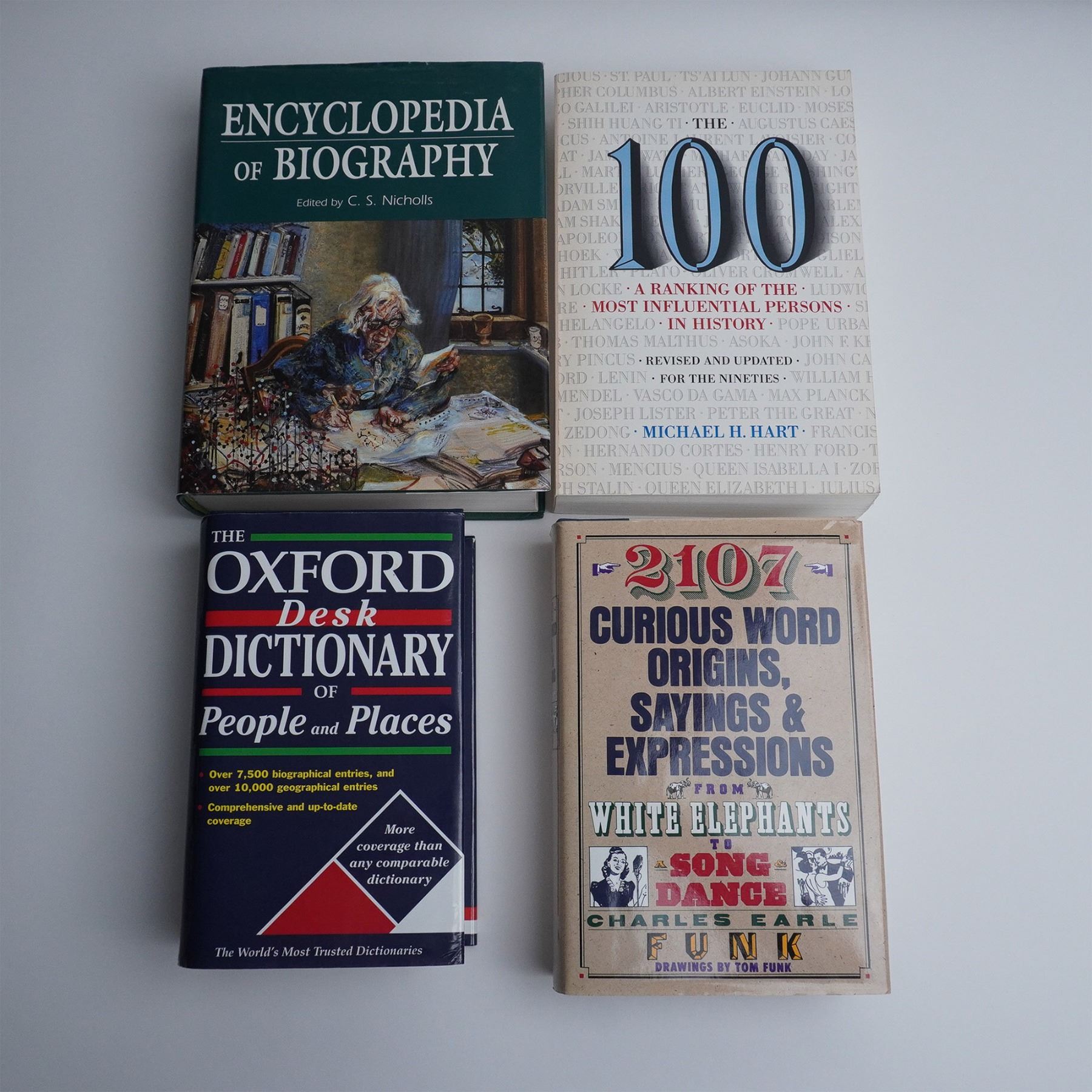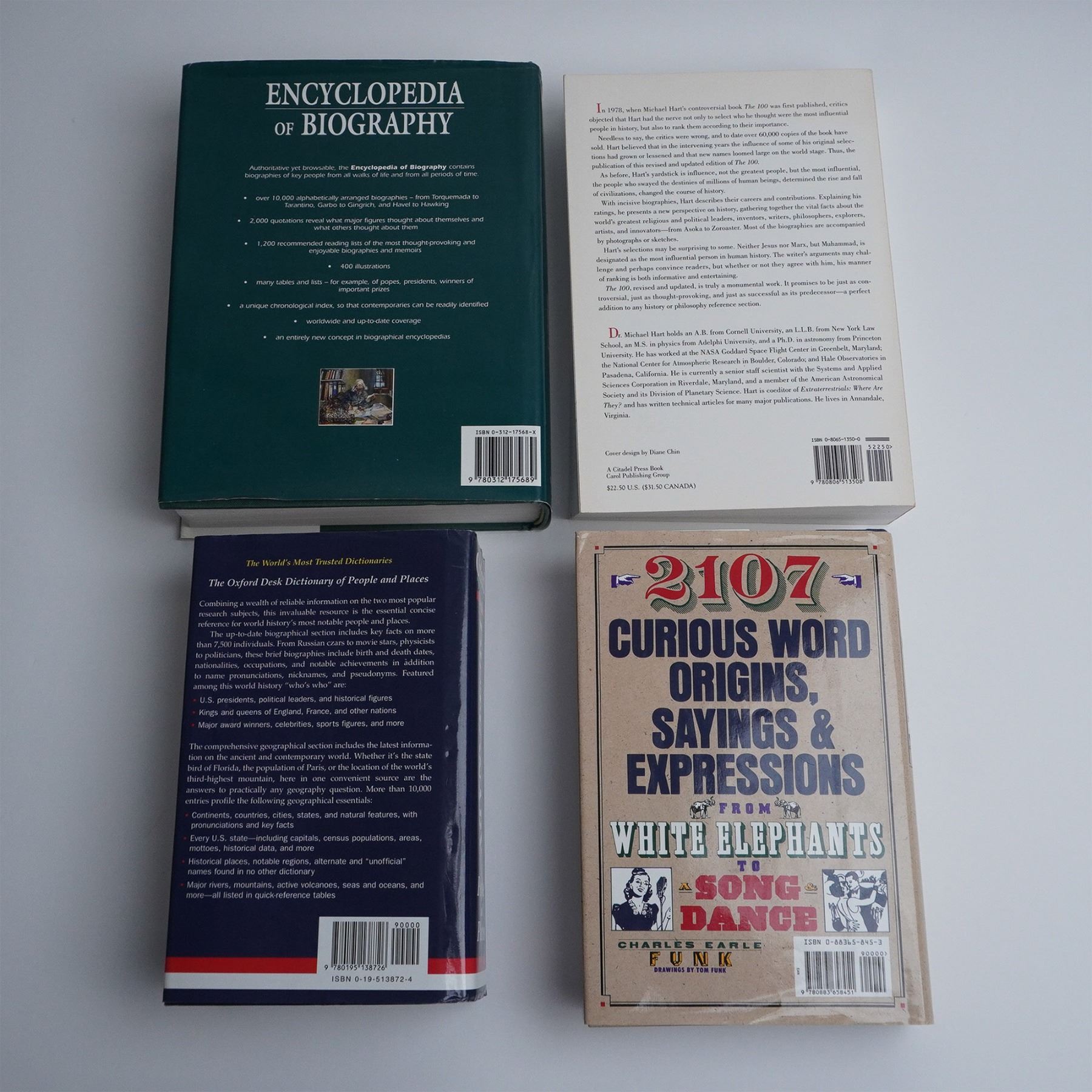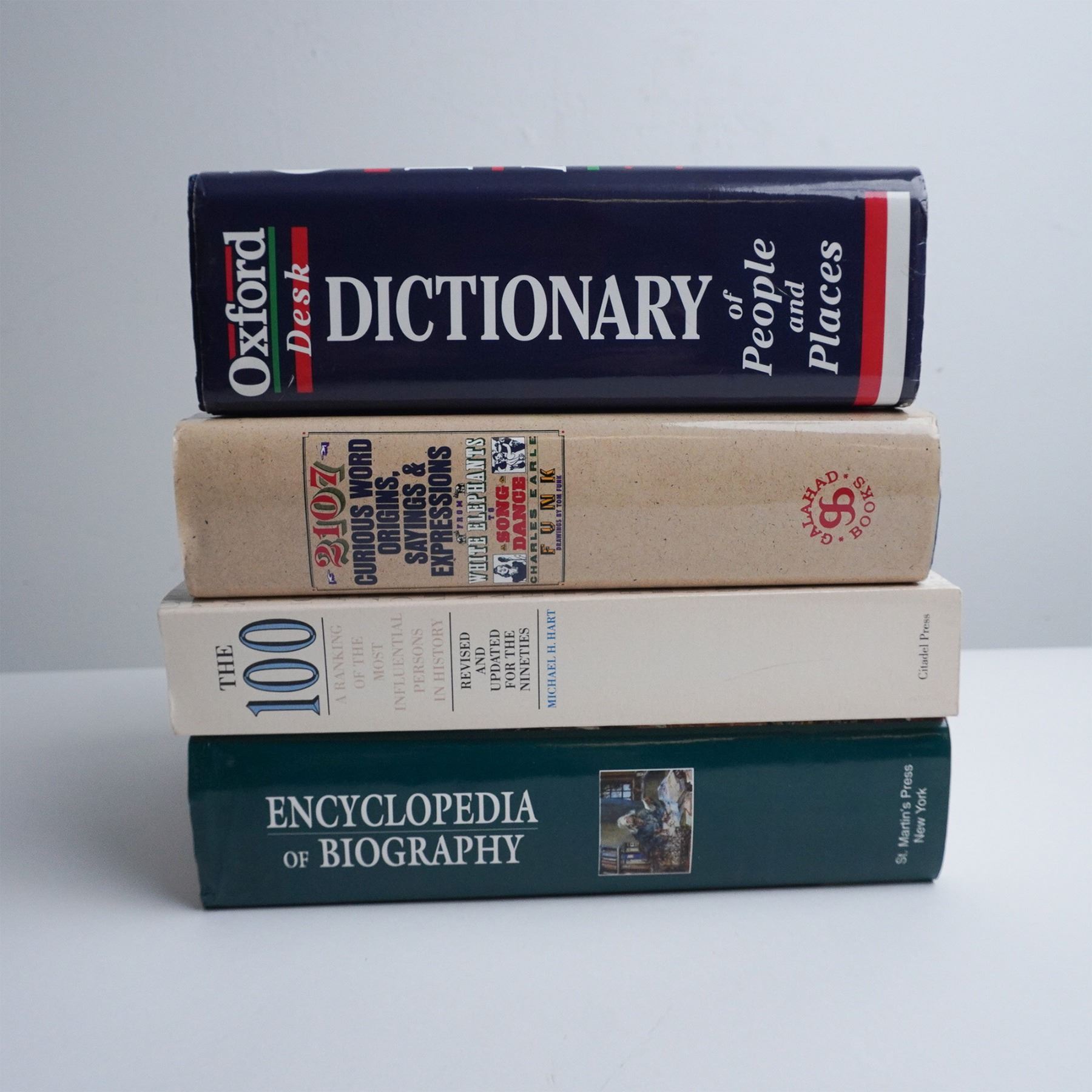 This lot includes four hardcover reference books spanning language, biography, and historical rankings. The set features Oxford Desk Dictionary of People and Places, a comprehensive reference covering geographical and biographical terms; 2107 Curious Word Origins, Sayings & Expressions by Charles Earle Funk, offering insights into the history and meaning of common phrases; The 100: A Ranking of the Most Influential Persons in History by Michael H. Hart, a thought-provoking assessment of historical figures who shaped civilization; and Encyclopedia of Biography, published by St. Martin's Press, providing detailed profiles of notable individuals. These books are valuable resources for scholars, writers, and collectors interested in language, history, and influential figures.