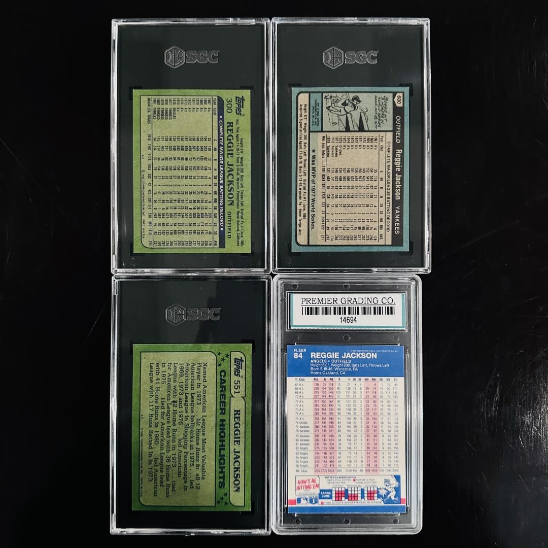 This four-card lot features legendary slugger Reggie Jackson across various stages of his career. Included are a 1982 Topps #300 graded SGC 7.5, a 1980 Topps #600 graded SGC 7, a 1982 Topps All-Star #551 graded SGC 6.5, and a 1984 Fleer #84 graded 8.5 by Premier Grading Co. These vintage cards highlight Jackson in Yankees and Angels uniforms, showcasing his iconic presence in MLB history. A great group of graded cards ideal for Reggie Jackson collectors and fans of Hall of Fame talent.