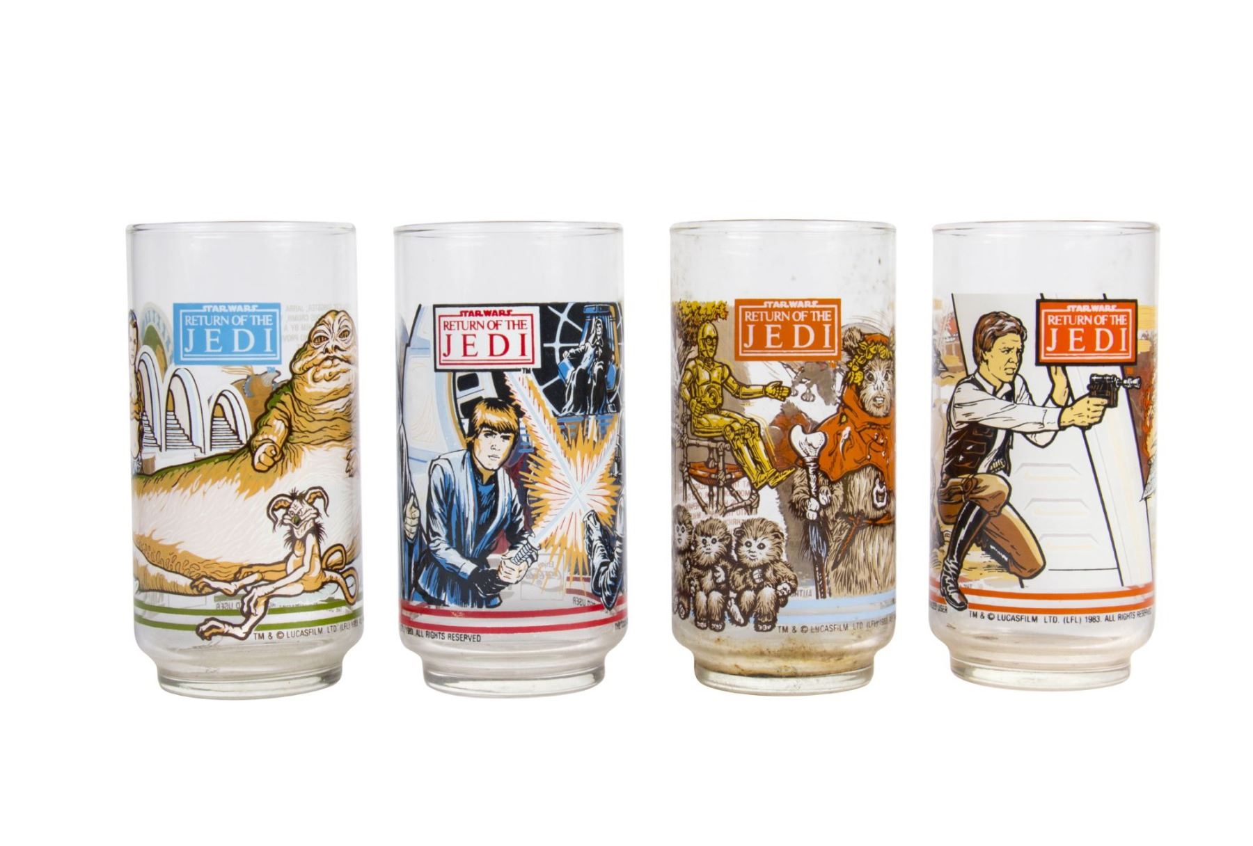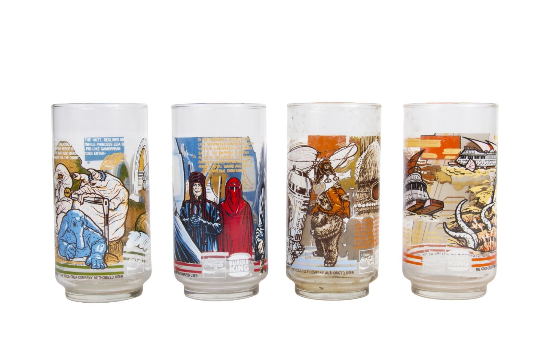 (LucasFilm, 1983) A set of (4) drinking glasses created as a Burger King promotion for "Return of the Jedi". The glasses feature several of the film's prominent characters and measure 2.75" in diameter and 5.5" tall. The condition is good, with some expected wear throughout from use and some discoloration to the interior of some of the glasses.