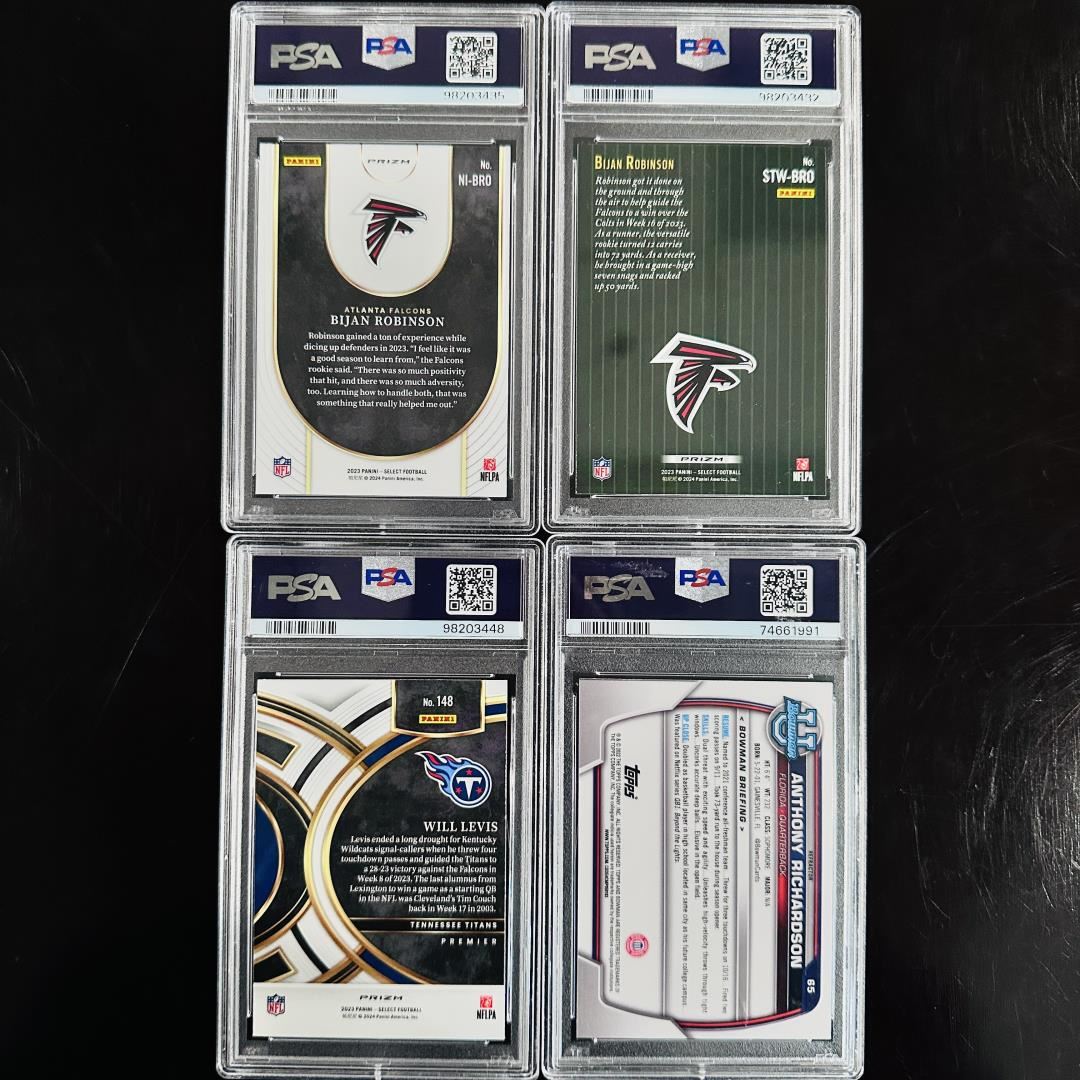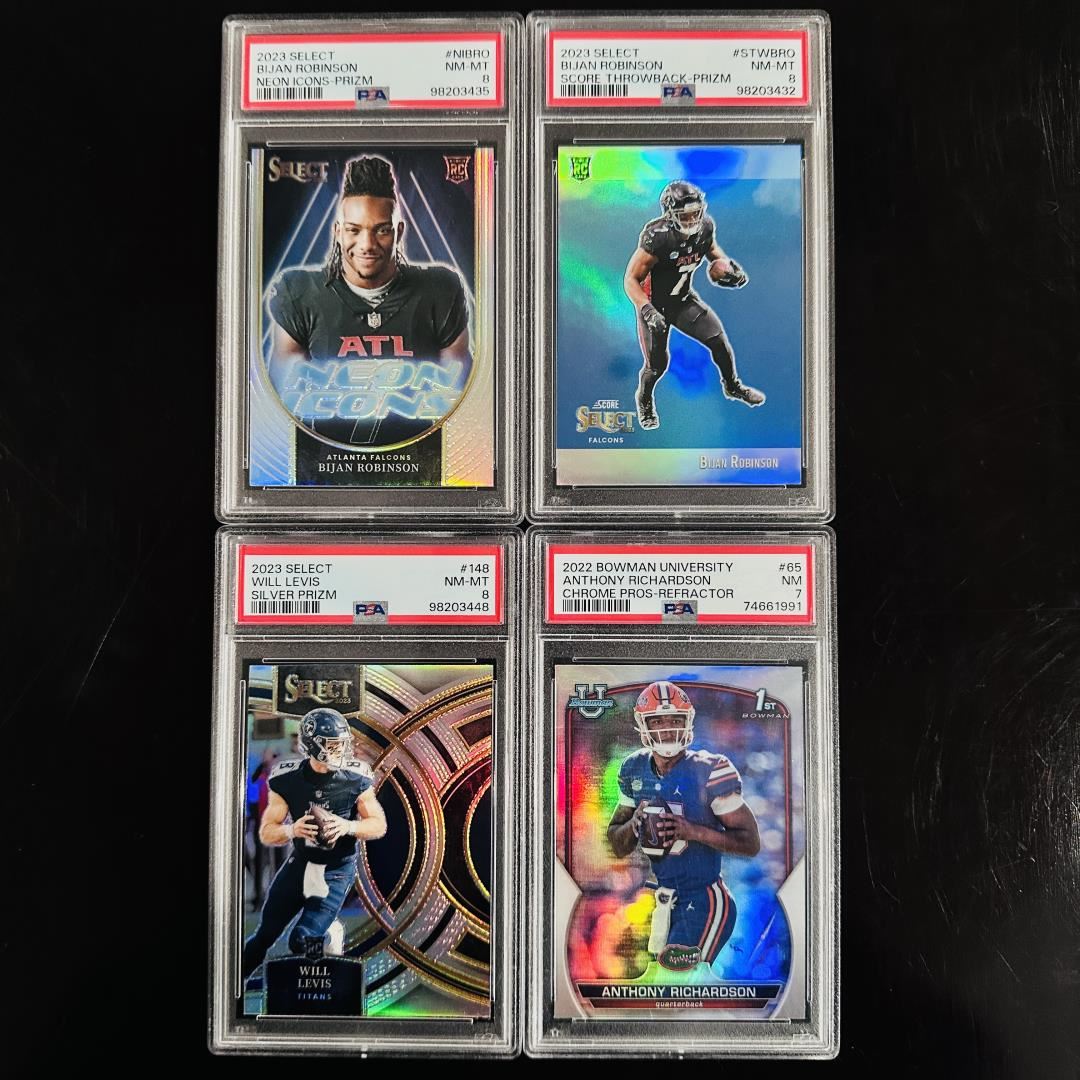 This four-card lot features 2022-2023 rookies graded by PSA, spotlighting three of the NFL's most anticipated young stars. Included are two Bijan Robinson cards: 2023 Select Neon Icons #NI-BRO and Score Throwback Prizm #STW-BRO, both graded PSA 8. Also featured is a 2023 Select Silver Prizm #148 of Will Levis, graded PSA 8, and a 2022 Bowman University Chrome Pros-Refractor #65 of Anthony Richardson, graded PSA 7. A flashy, modern rookie lineup ideal for collectors chasing the league's next breakout talent.