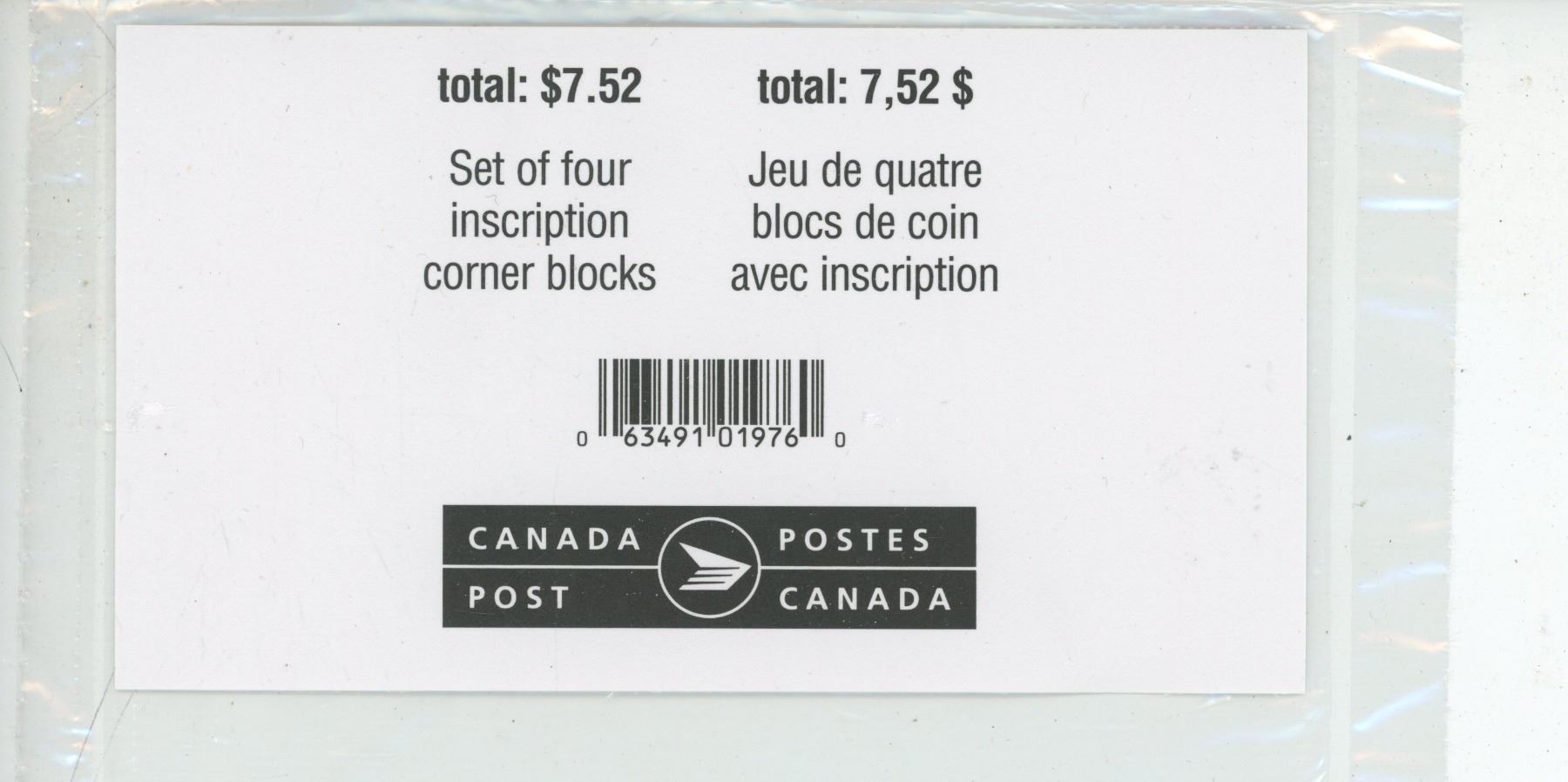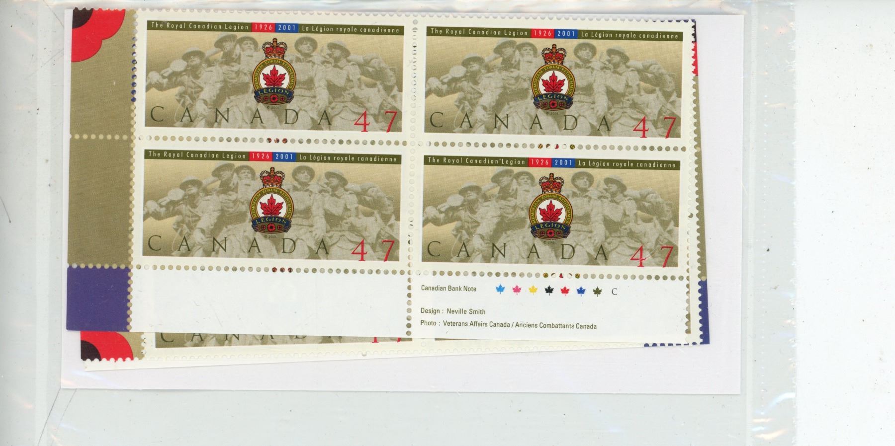 Set of 4 Royal Canadian Legion 47 Cents Stamp Corner Blocks. Total of $7.52 face value. Housed in its unopened Canada Post packaging. Mint.