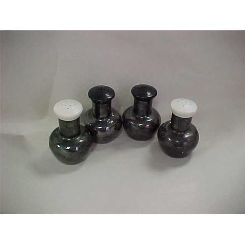 Set of 4 Salt and Pepper Shakers-probably silver! They are tarnished and look like they would clean up, so I am assuming silver plate. 2 white and 2 black lids with stopper bottoms. About 2.5".