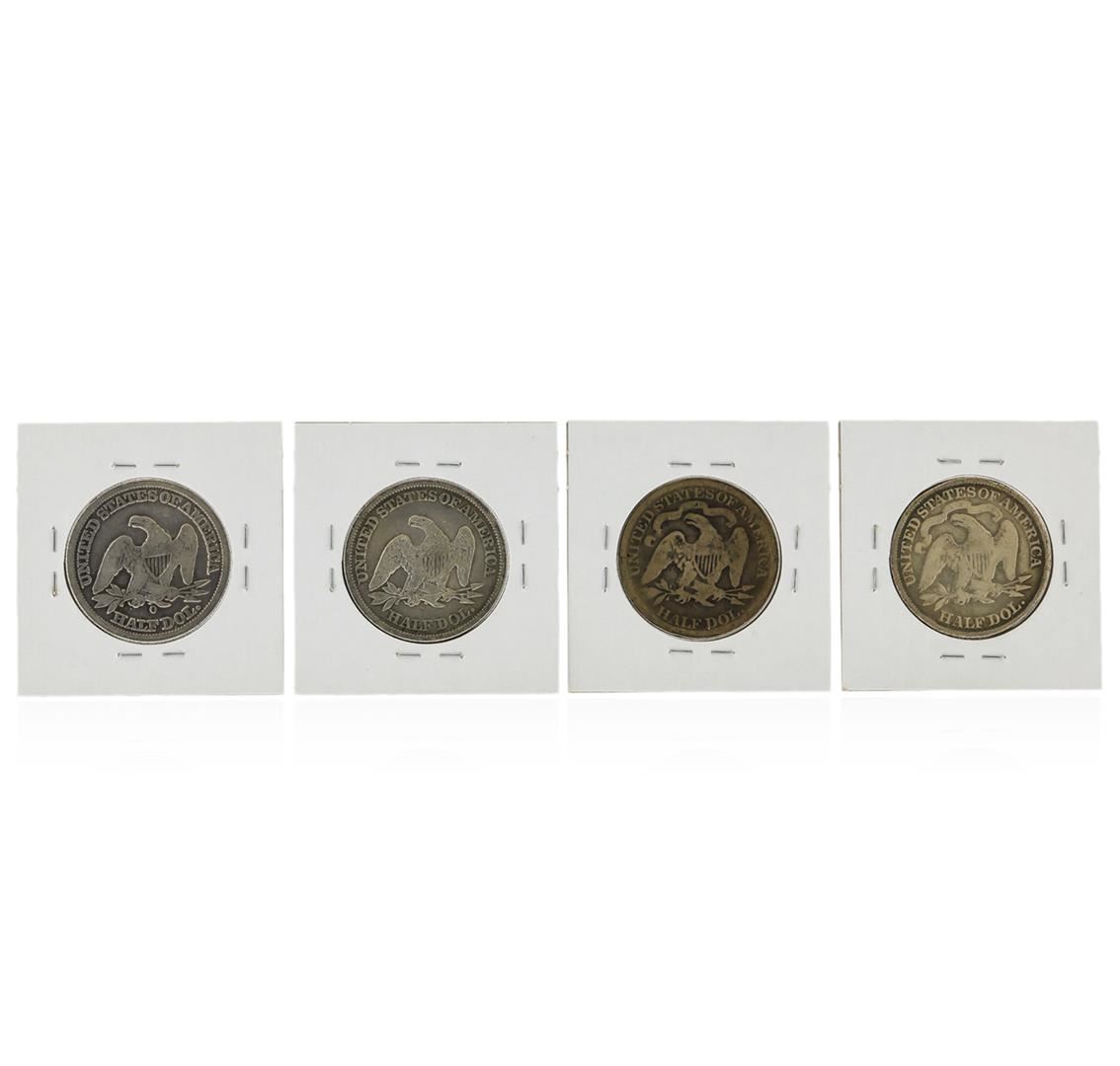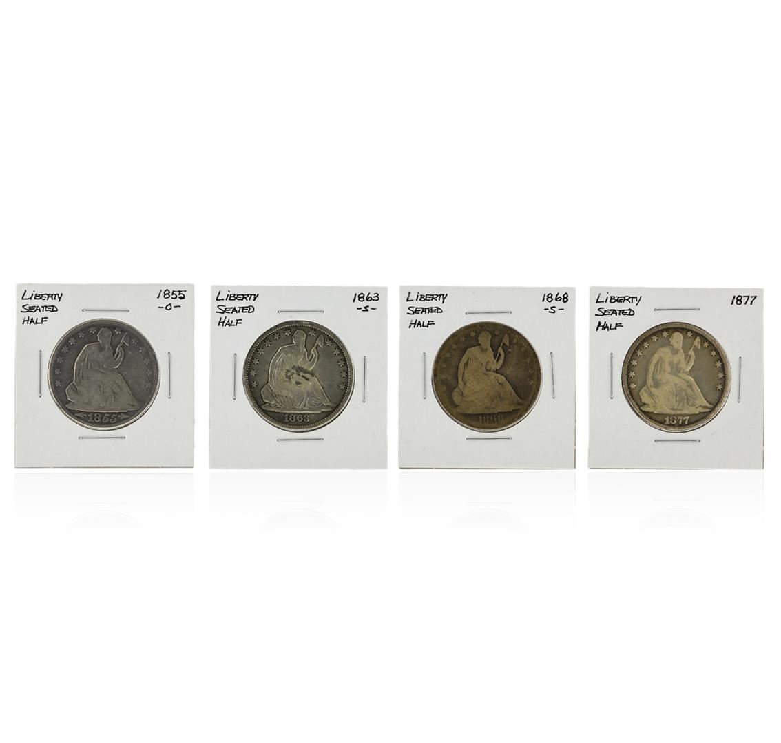 One set of (4) Silver Liberty Seated Half Dollar Coins including the following dates: 1855-O, 1863-S, 1868-S, and 1877.