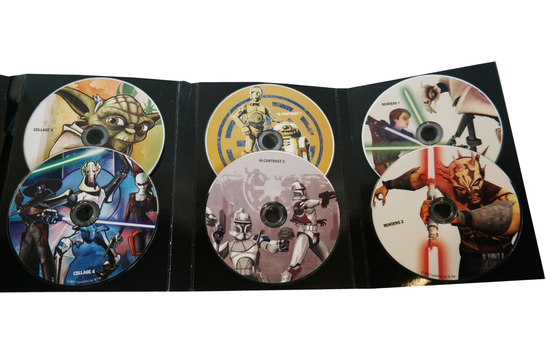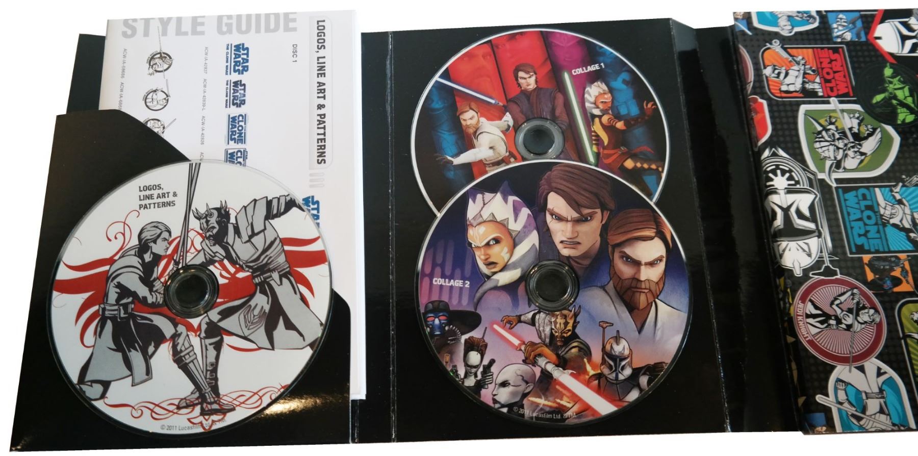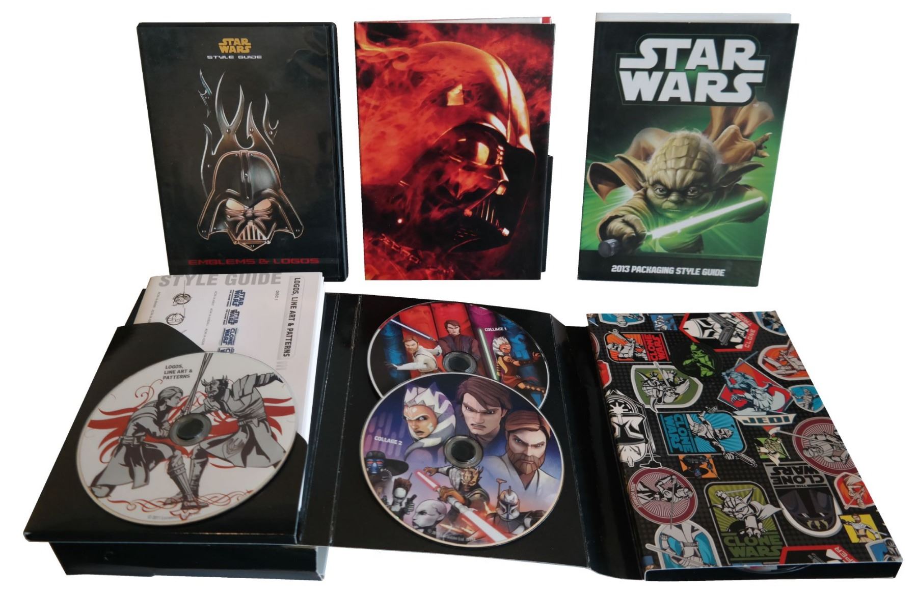 (LucasFilm, 2004-2013) A very rare set of (4) "Style Guide" packets from the "Star Wars" series. These "Style Guides" contain designs of characters, logos, fonts, artwork, and much more that could be used in the creation of merchandising and promotional materials. The set includes a 2004 "Revenge of the Sith" 2-disc case, a 2011 "The Clone Wars" 9-disc case, a 2013 case with a chip inside containing the materials, and a 2013 "Episode III" case with a chip inside. Each of the style guides appear to be in very good condition with some creasing and minor wear to the packaging, but overall functionality for the discs or chips has not been tested. The style guides come in standard DVD sized cases.