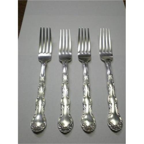 Set of 4 Sterling Silver Forks. In good but used condition. Each have the normal usage scratches. Each are marked on back: ALVIN STERLING, FRENCH SCROLL. All four forks weigh approximately 6 ounces. Still very useable.