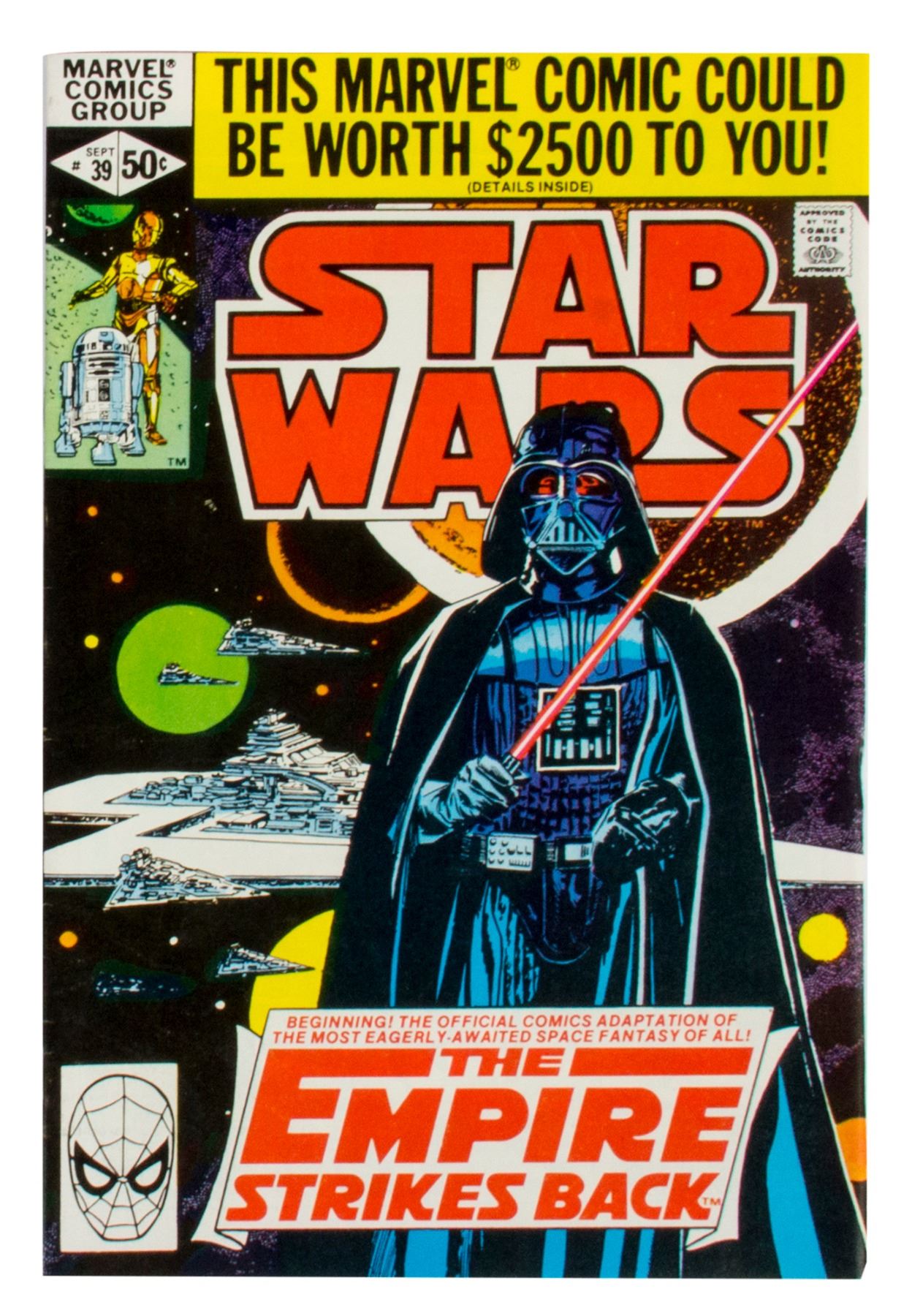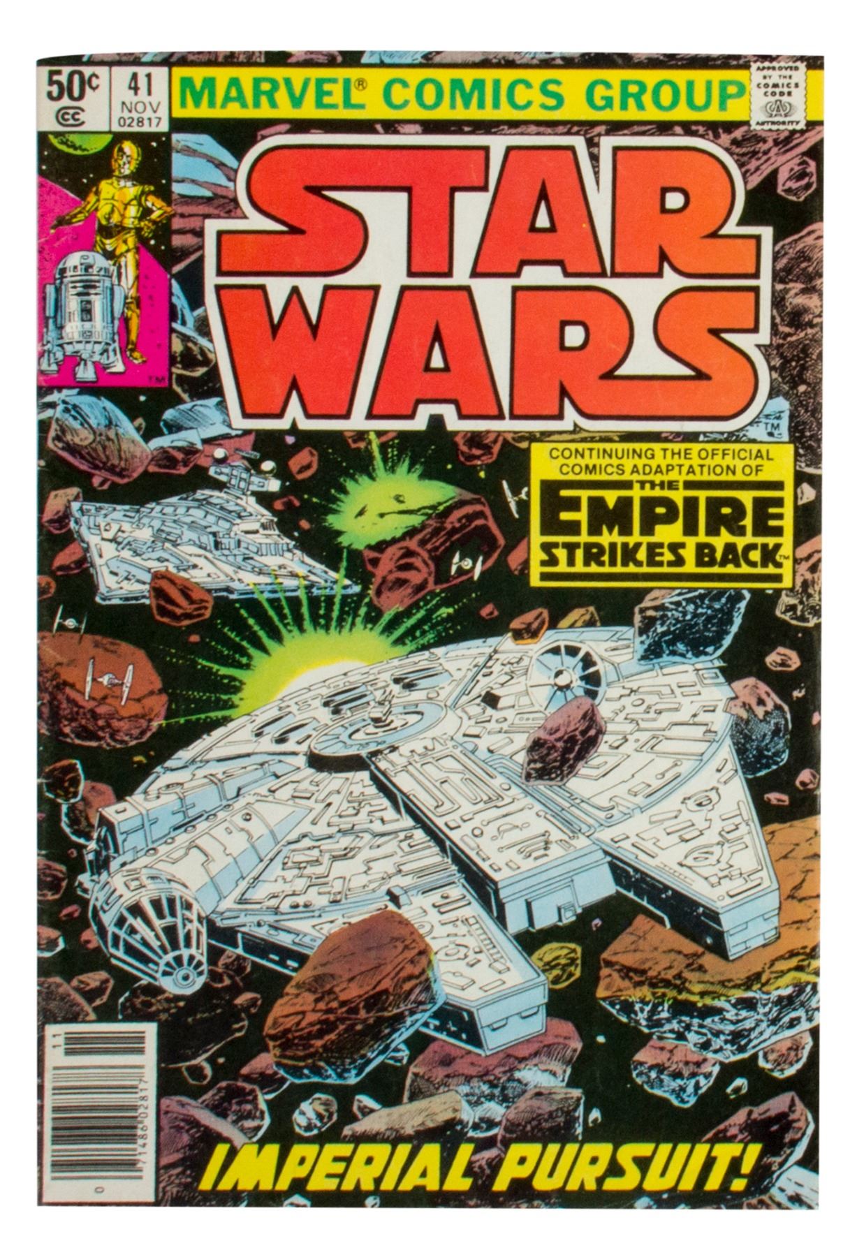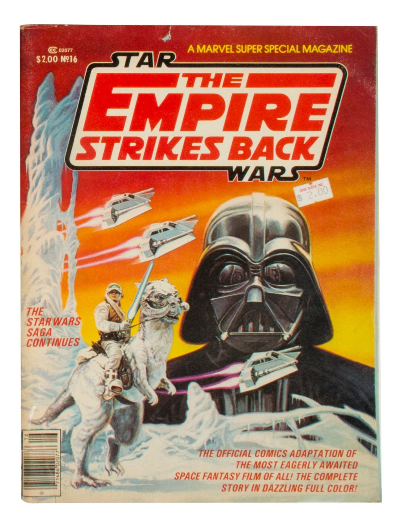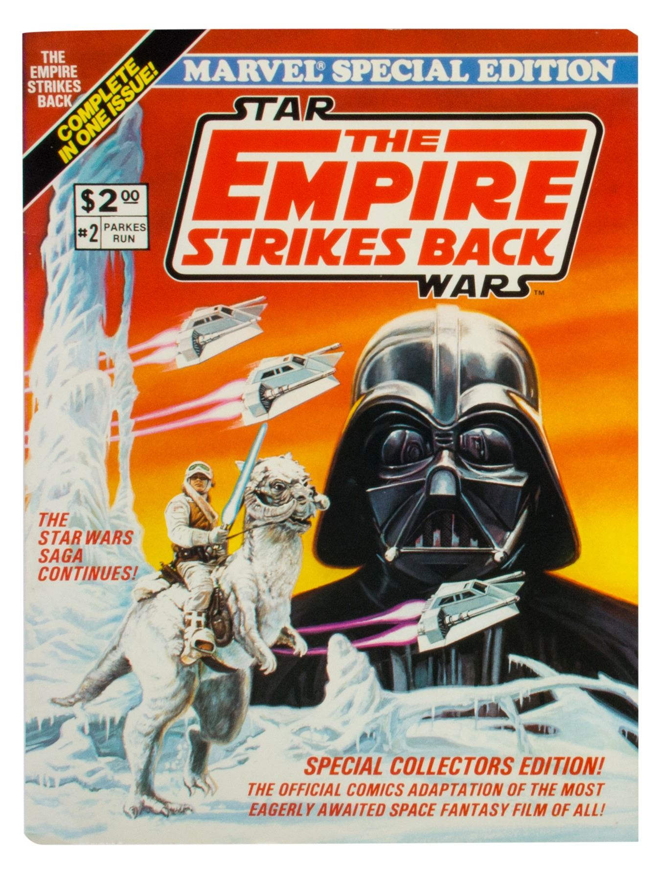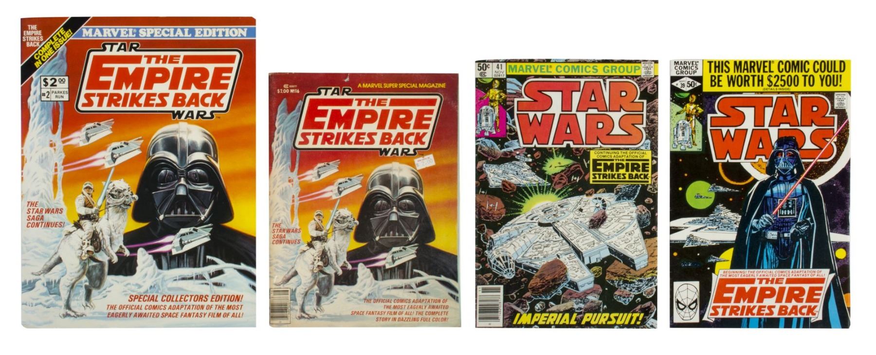(Marvel, c.1980) A fantastic collection of (4) comic books created by Marvel for "The Empire Strikes Back". The collection includes "The Empire Strikes Back" Vol 1 No 39 and Vol 1 No 41, and well as two larger Marvel Special Editions that come in alternate sizes and alternate paper used but feature matching cover imagery. The comics range in size from the smaller 10.25"x6.75" comics to the largest 13.25"x10" Special Edition. The collection is in good condition overall with some wear throughout from use. The smaller Special Edition has the most wear, including a loose cover and some discoloration to the cover, as well as a price sticker attached. All of the comics still present well and read well.