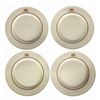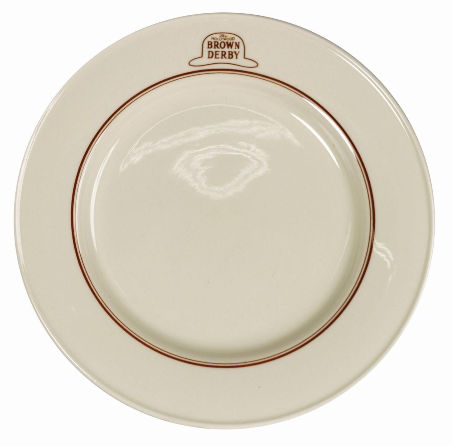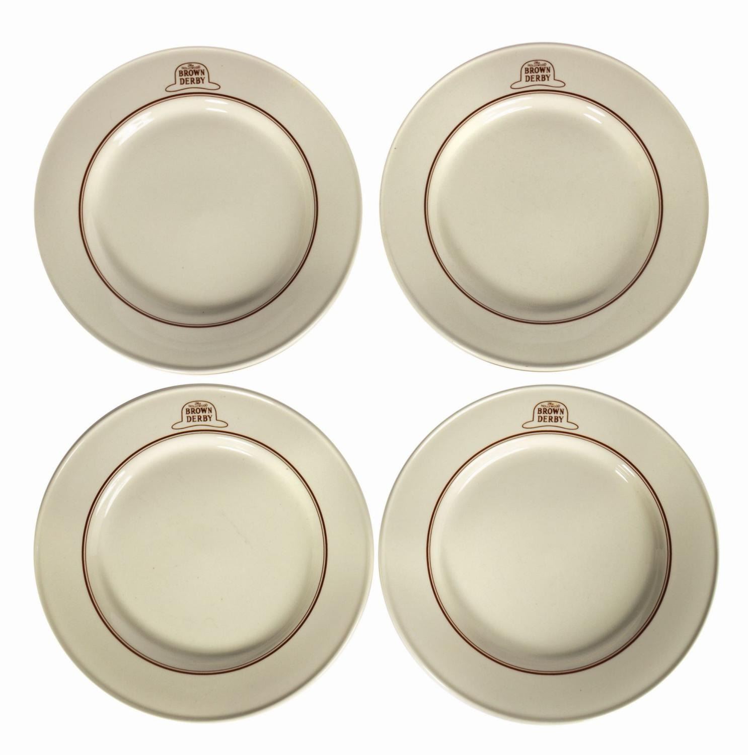 (Disney-MGM, c.1990s) A set of (4) dinner plates from the Hollywood Brown Derby at Disney's Hollywood Studios. Based on the famous Los Angeles-area celebrity haunt, the restaurant takes architectural and decor inspiration from the Derby's famous Hollywood branch, with Spanish Mission-style exteriors and banquette booth lined interiors. These thick ceramic plates are virtually identical to those used by legends of the silver screen during cinema's Golden Age, featuring stately chocolate brown double line trim with a "The Hollywood Brown Derby" logo to distinguish it from the original "The Brown Derby." Measuring 12" in diameter, the plates are in very good condition with occasional scratches and scuffs consistent with park use.