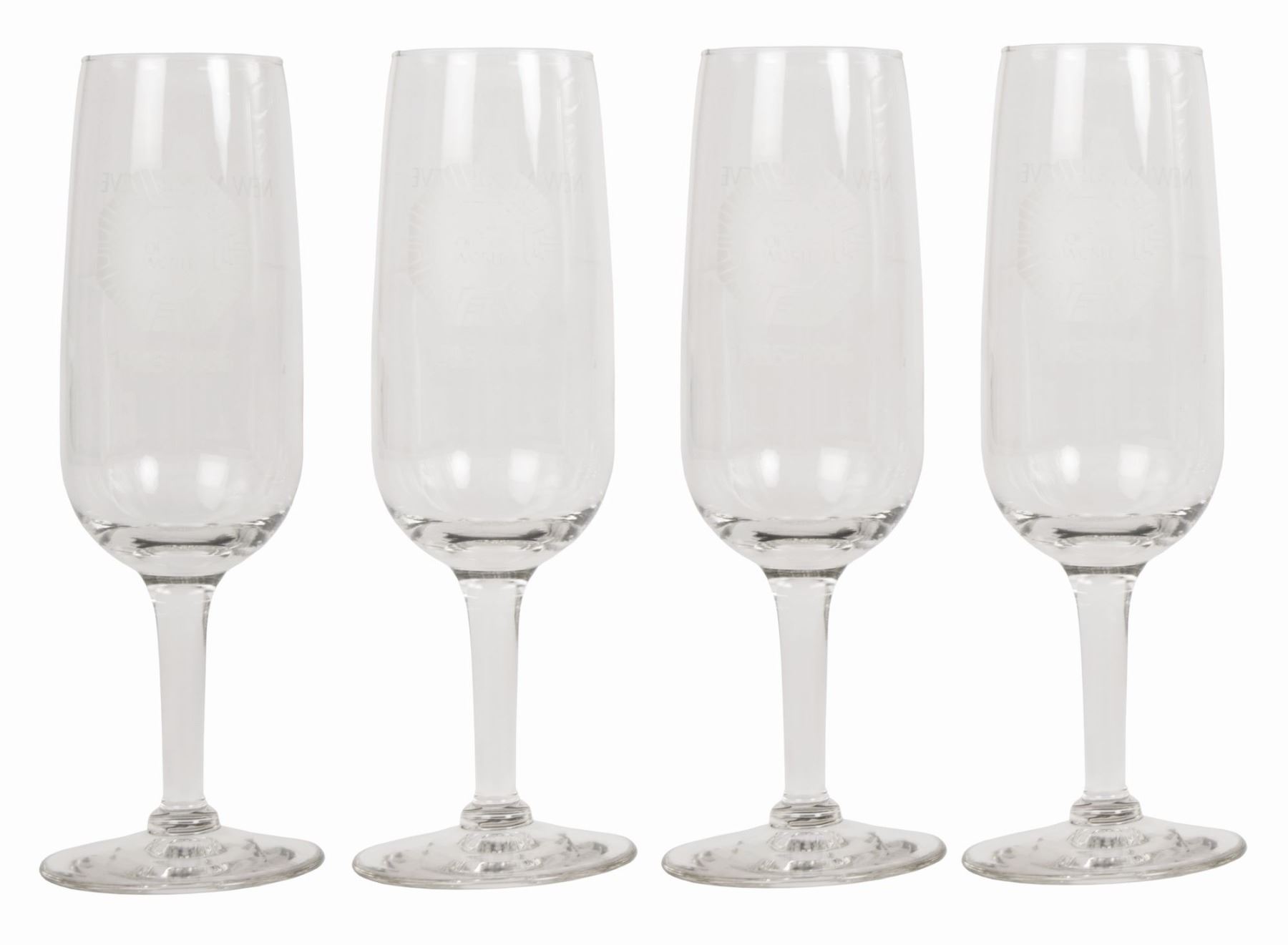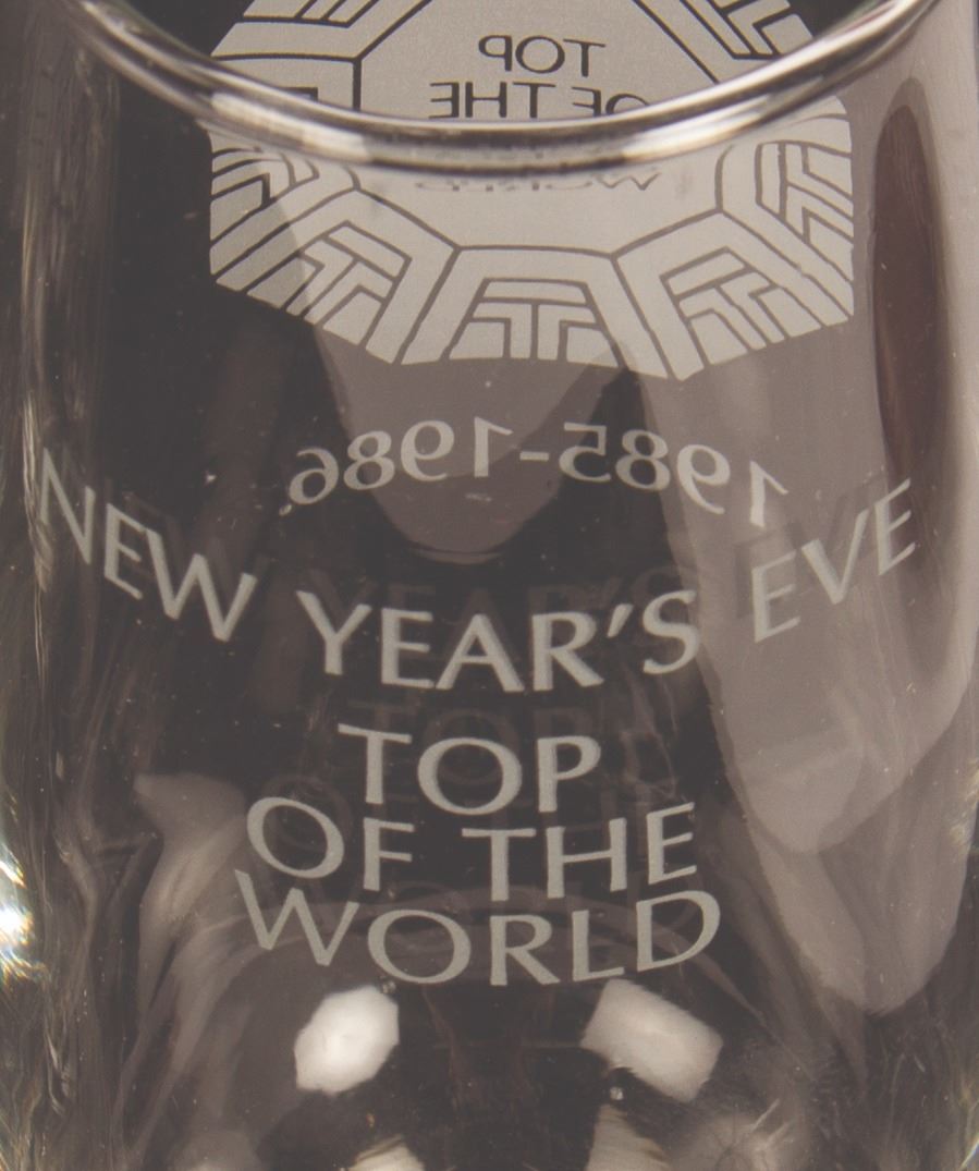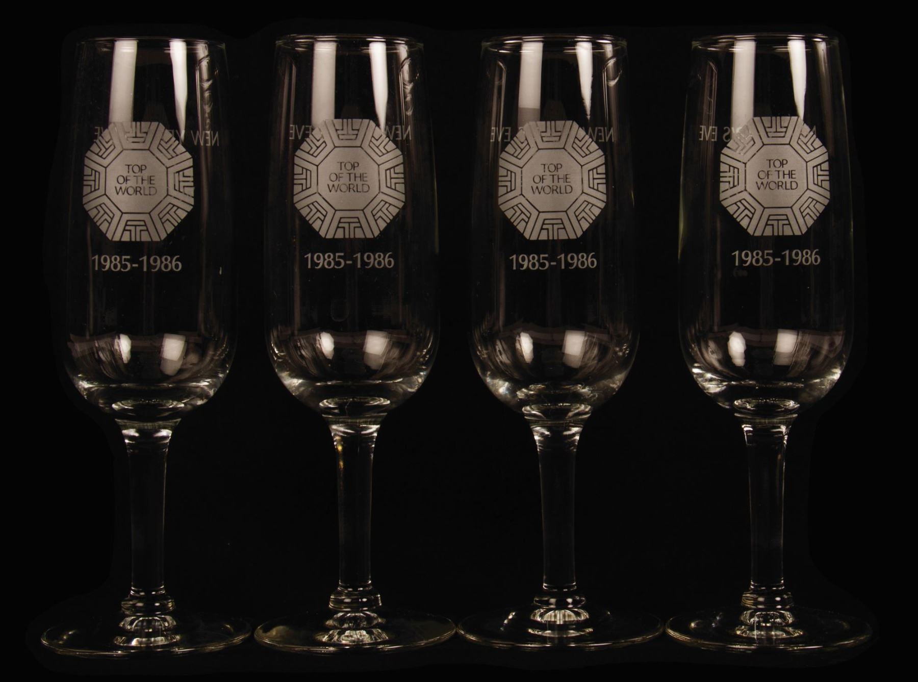 (Contemporary Resort, 1985) A very rare set of (4) glass champagne flutes from the exclusive 1985-86 New Year's Eve event at the Top of the World restaurant. Located on the 15th floor of the Contemporary Resort, this popular former location opened October 1, 1971 and closed September 30, 1993. With guests dressed to the nines, and unique offerings of food and entertainment, this location is still well-remembered by countless park guests. These flutes measure 2.5" in diameter and 7.25" tall, and the set is in very fine condition overall with minor wear from use.