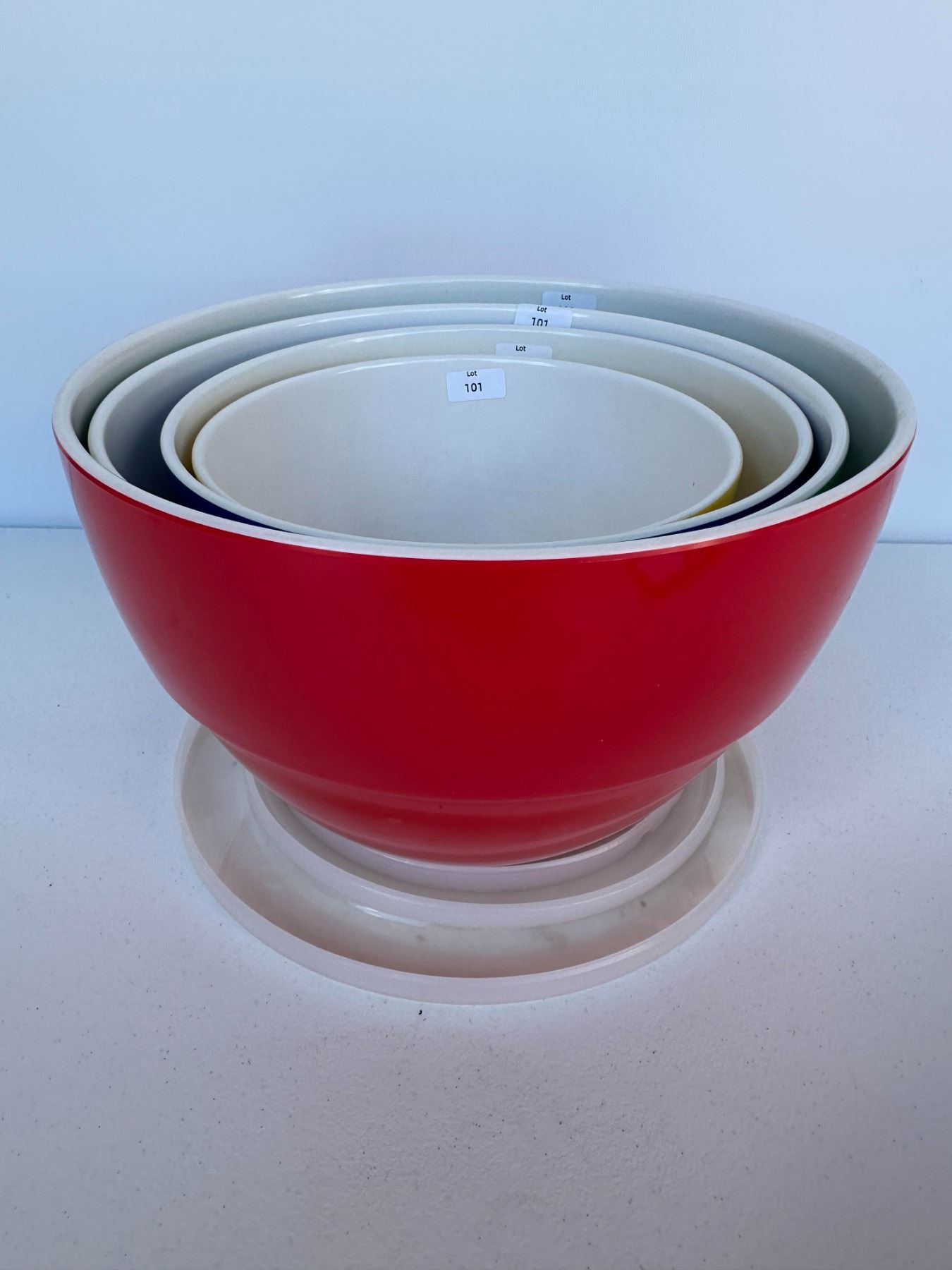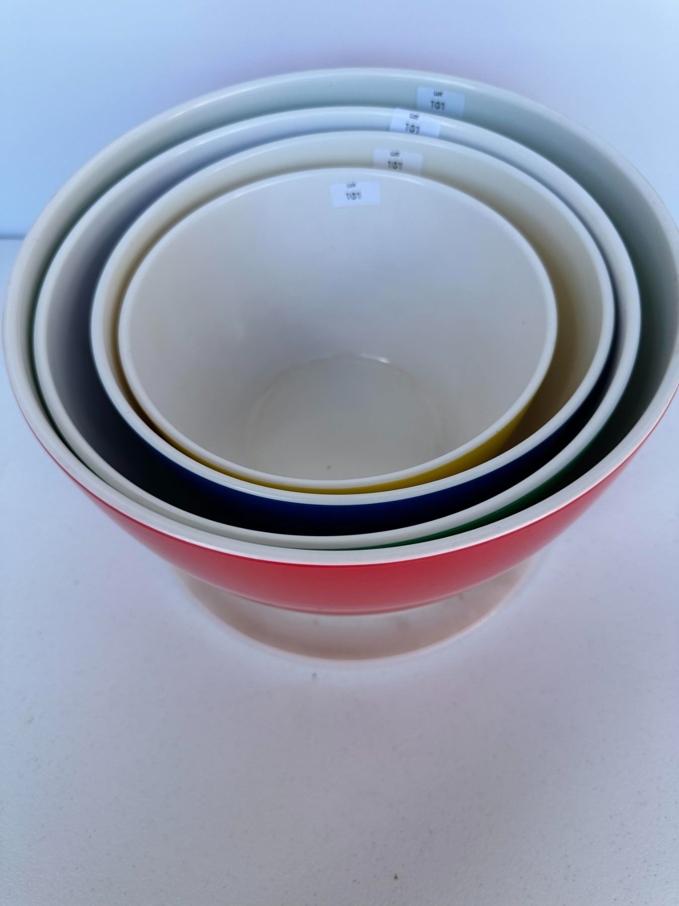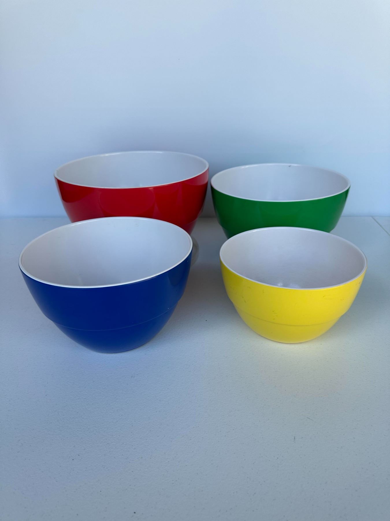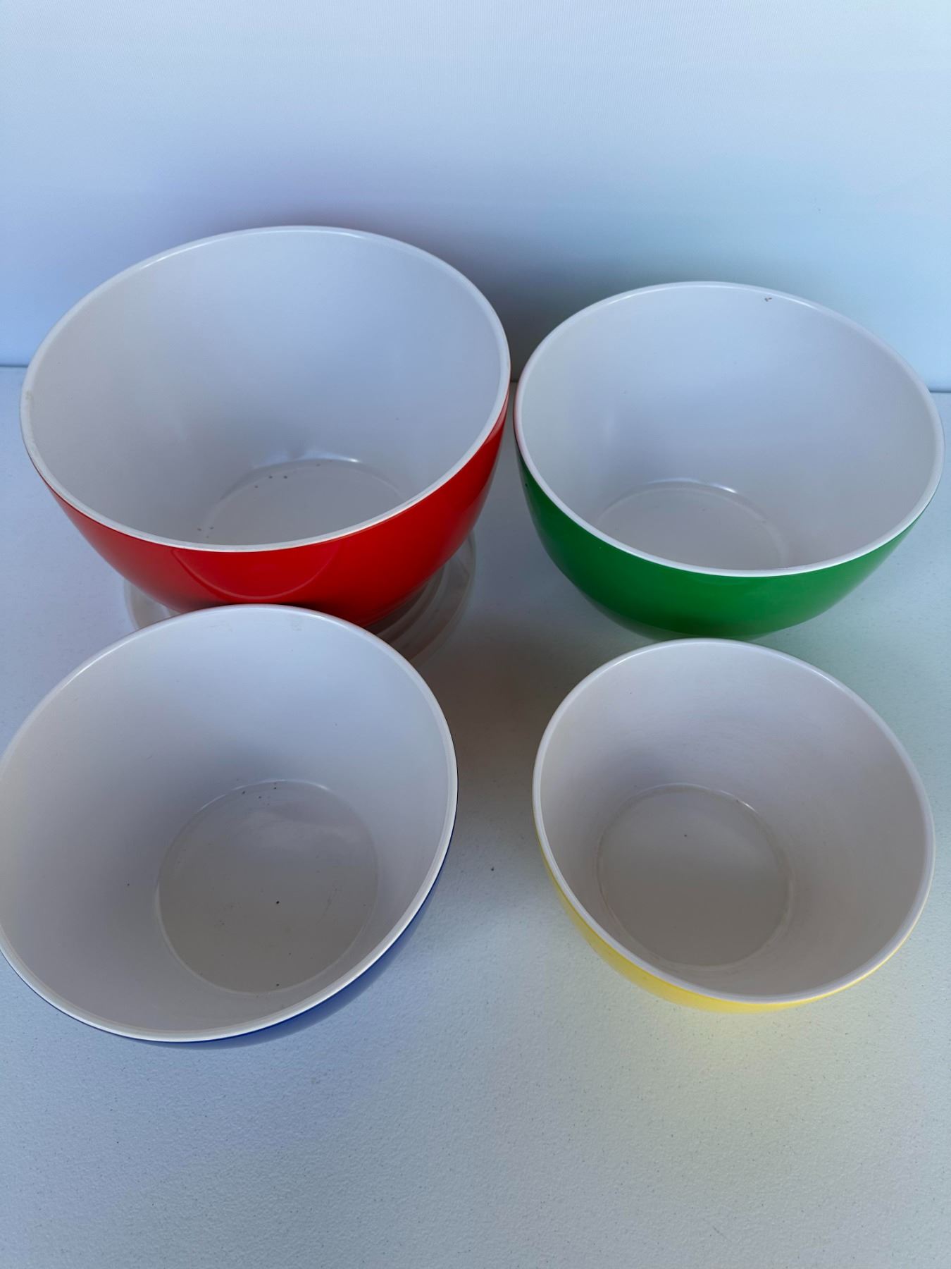 Retro set of four plastic nesting mixing bowls in bright primary colors (red, green, blue, yellow). White interiors. Cheerful and practical addition to any vintage kitchen décor.