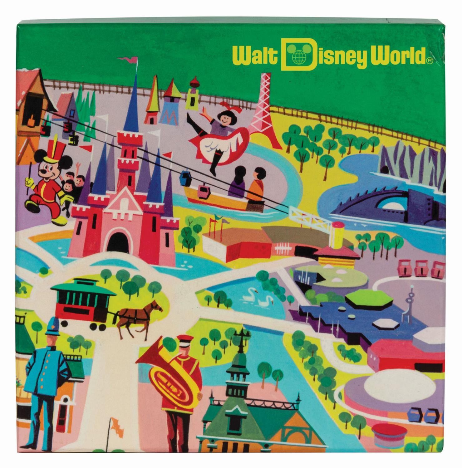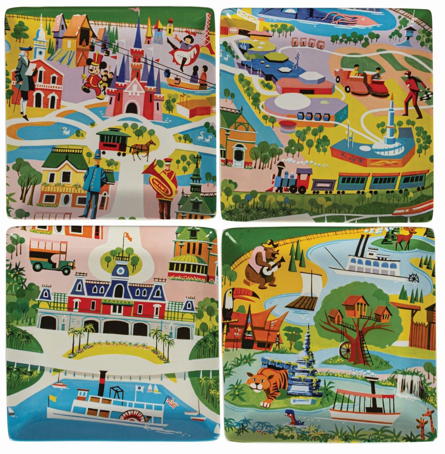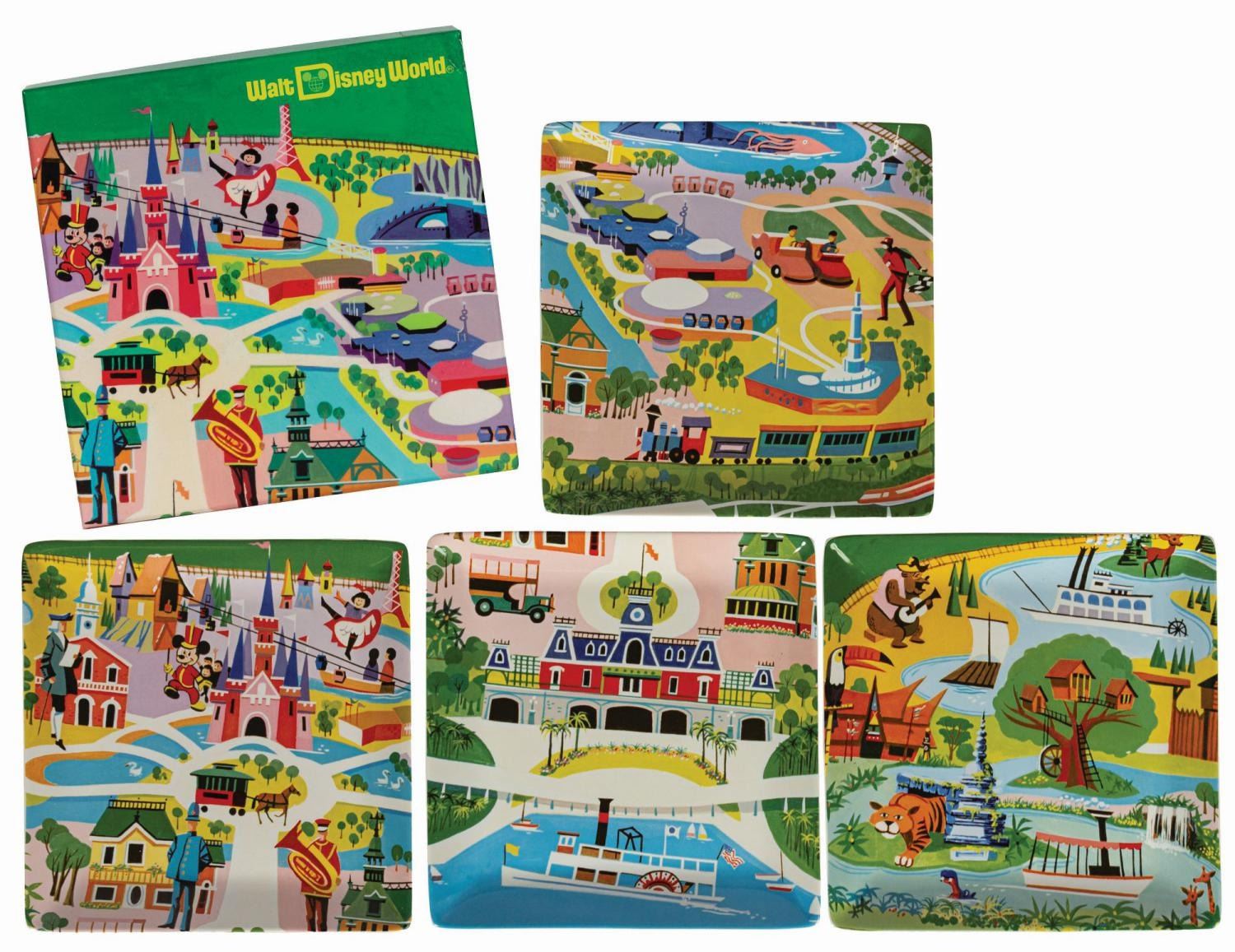 (Walt Disney World, 2011) A set of (4) square ceramic plates created in celebration of the 40th anniversary of the Magic Kingdom at Walt Disney World. The plates feature colorful artwork adapted by Kevin Kidney and Jody Daily from a 1970s Walt Disney World Preview Center Map. Housed in the original box, the plates each measure 8.5"x8.5" and are in fine unused condition. The box measures 9"x9" and 3.5" deep and is in very good condition. The lower right corner has split and been repaired with transparent tape.