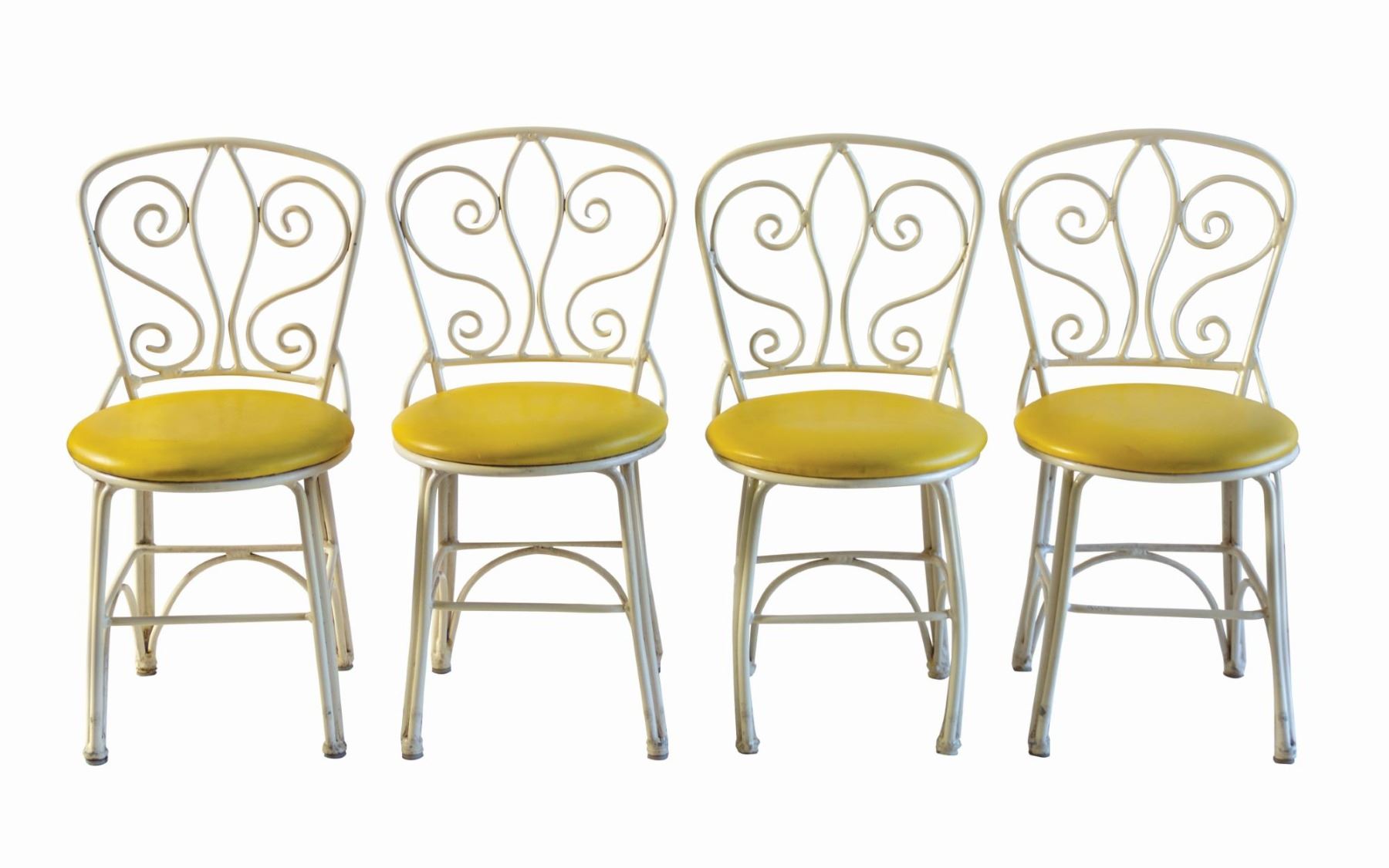(Disneyland, c.2000s) An original set of (4) chairs used at Disneyland's Plaza Pavilion restaurant on Main Street. These chairs have metal frames with yellow padded cushions, and are beautiful and functional artifacts from this currently closed Disneyland location. Measuring 34" tall each, the chairs are in very good condition with surface and paint wear from use, including a small tear in the fabric of one of the chairs. Some of the legs are slightly bent from use, and some of the plastic feet caps are missing. This item will require special shipping arrangements. Please contact us for details and estimates.