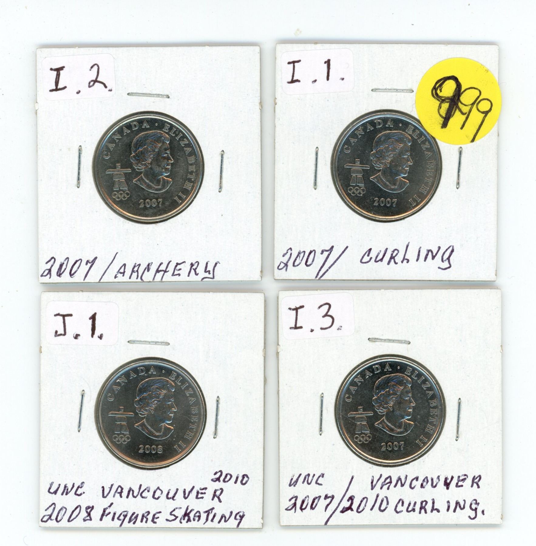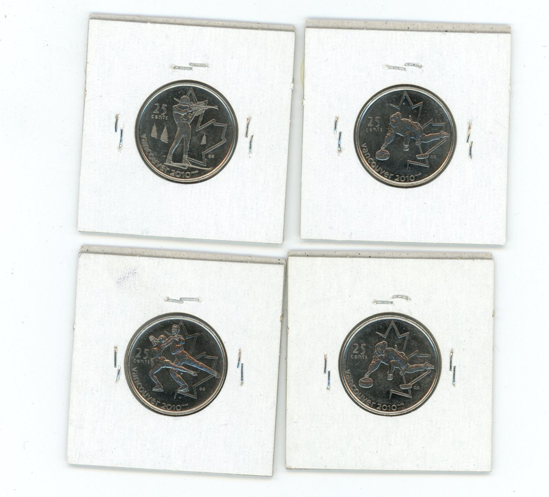 Set of 4 canadian quarters three 2007 vancouver 2010 olympic curling and arehcerysport and one 2008 vancouver 2010 olympic figure skating sport