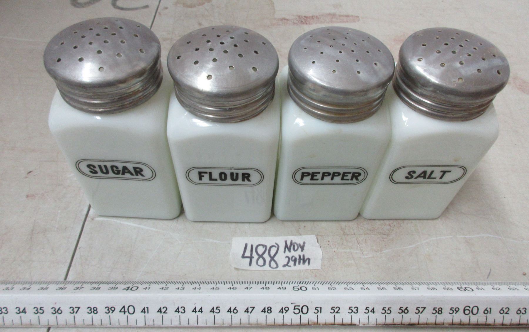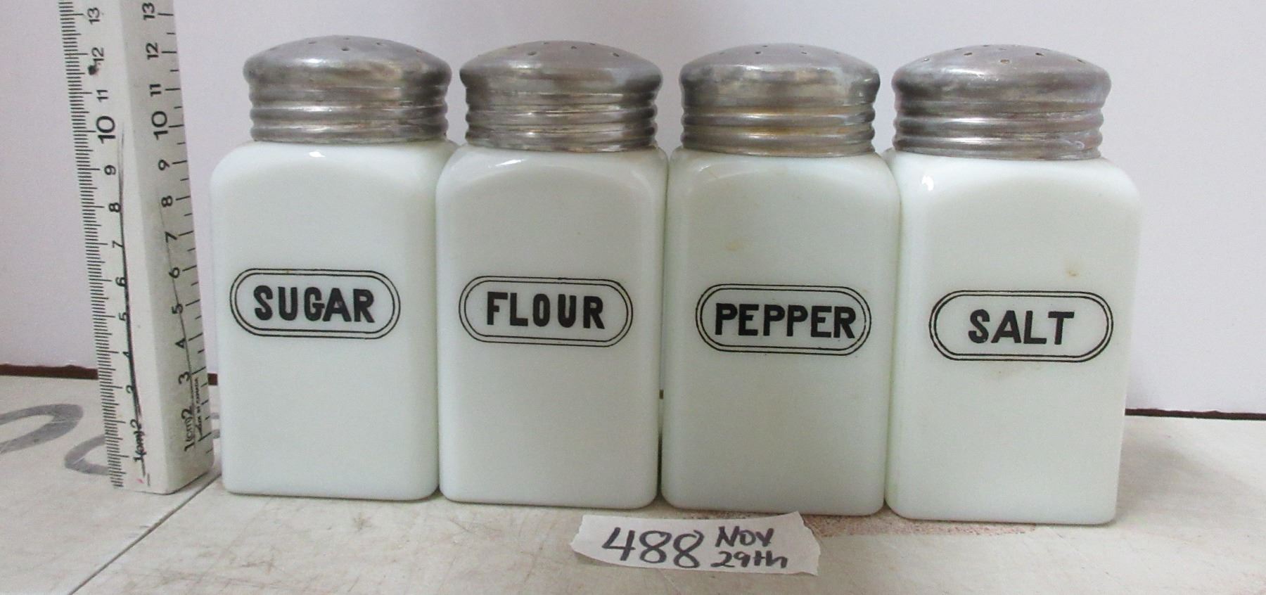 Set of 4 different Hoosier Shaker set (flour,sugar,salt,pepper)