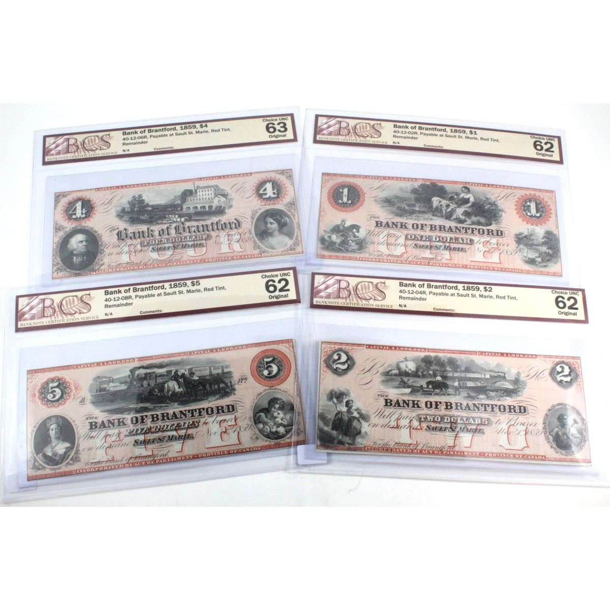 Set of 4 x Remainder Notes from the Bank of Brantford BCS Certified CUNC-62, Original. You will receive an 1859 $1, $2, $4, and $5. Buyers Premium will be added on all items as per our terms of sale. We accept Paypal, Credit Card, E-Transfer Payments, Cheque or Money Orders (there is an additional 3% fee for using Paypal or Credit Card). All invoices will be emailed immediately following the auction, please contact us if you would like to pay by credit card or receive a new revised lower total for mailing in payment or sending an e-transfer (3% discount). All Items Are Sold "AS IS", no returns