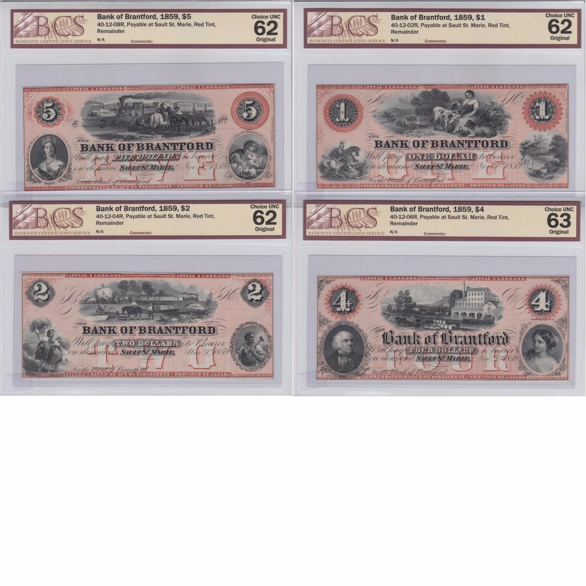 Set of 4 x Remainder notes from the Bank of Brantford BCS Certified CUNC-62, Original. You will receive an 1859 $1, $2, $4, and $5