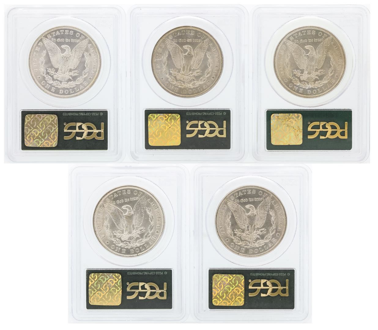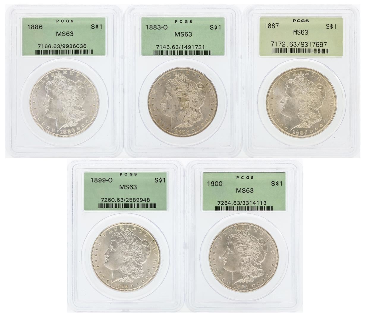 One Set of (5) $1 Morgan Silver Dollar Coins PCGS MS63 Green Holders. PCGS Graded.