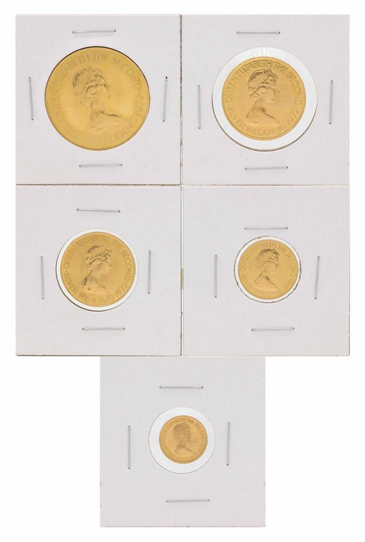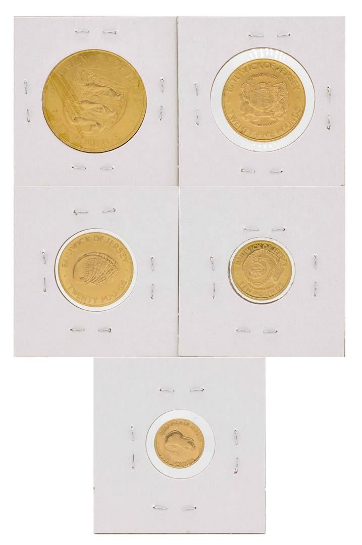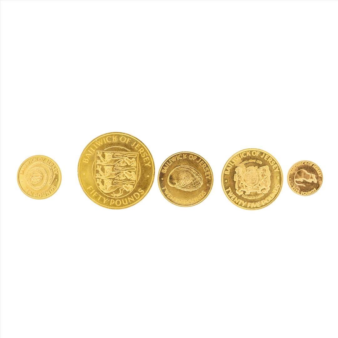 One Set of (5) 1972 Bailiwick of Jersey Gold Coins. (1) five pound gold coin, (1) ten pound gold coin, (1) twenty pound gold coin, (1) twenty five pound gold coin, and (1) fifty pound gold coin.