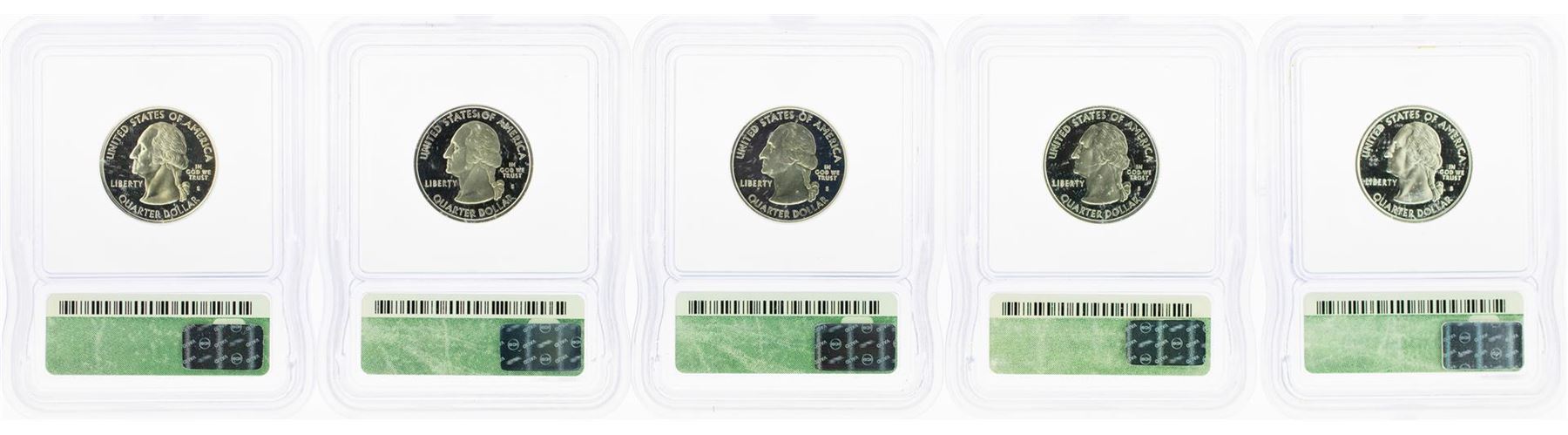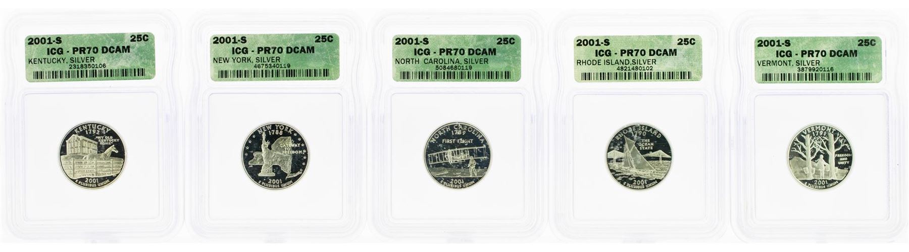 One Set of (5) 2001-S Statehood Quarter Silver Coins ICG PR70 DCAM. ICG Certified.