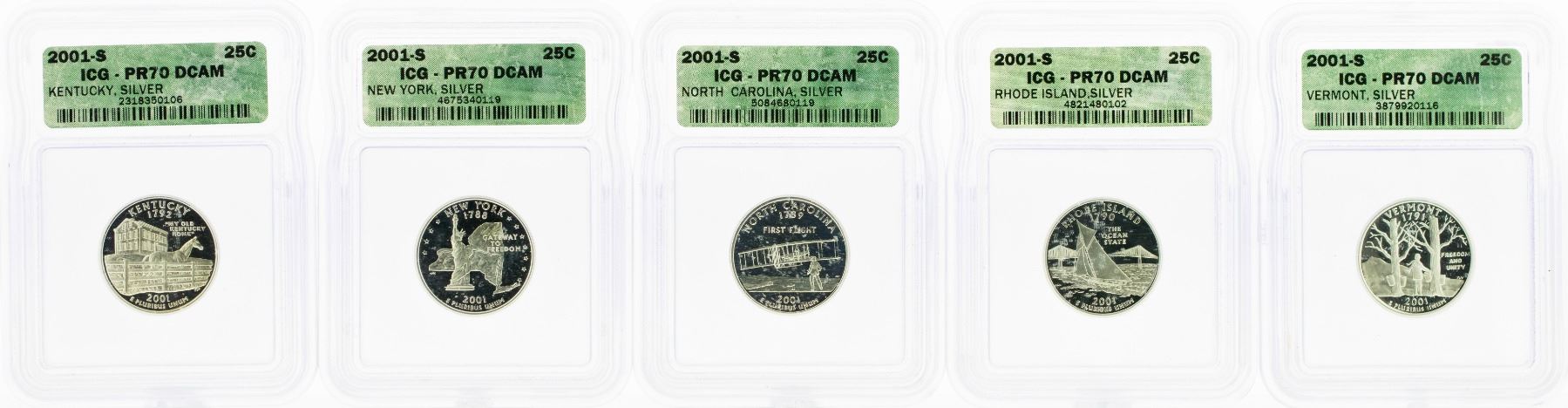 One Set of (5) 2001-S Statehood Quarter Silver Coins ICG PR70 DCAM.
