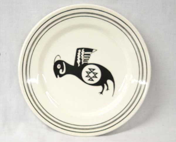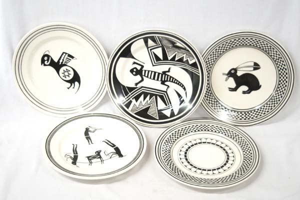 Set of 5 Anasazi-Traders Mimbres Black on White Ceramic Decorative Plates, made in Ecuador, measure 11''D, designs include lizard, geometric, parrot, hunting party, and rabbit, for decorative use only