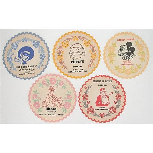 These large coasters feature The Lone Ranger, Popeye, Mickey Mouse, Blondie, and Jiggs, each measures 5" in diameter, are linen-like and embossed with floral designs, very nice quality and size, from the Chicago Harold-American.