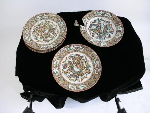 China (19th Century) porcelain with colorful glazed and gilt butterfly motif. One plate has a broken edge, piece included - otherwise are very good condition, dia. 10" each.