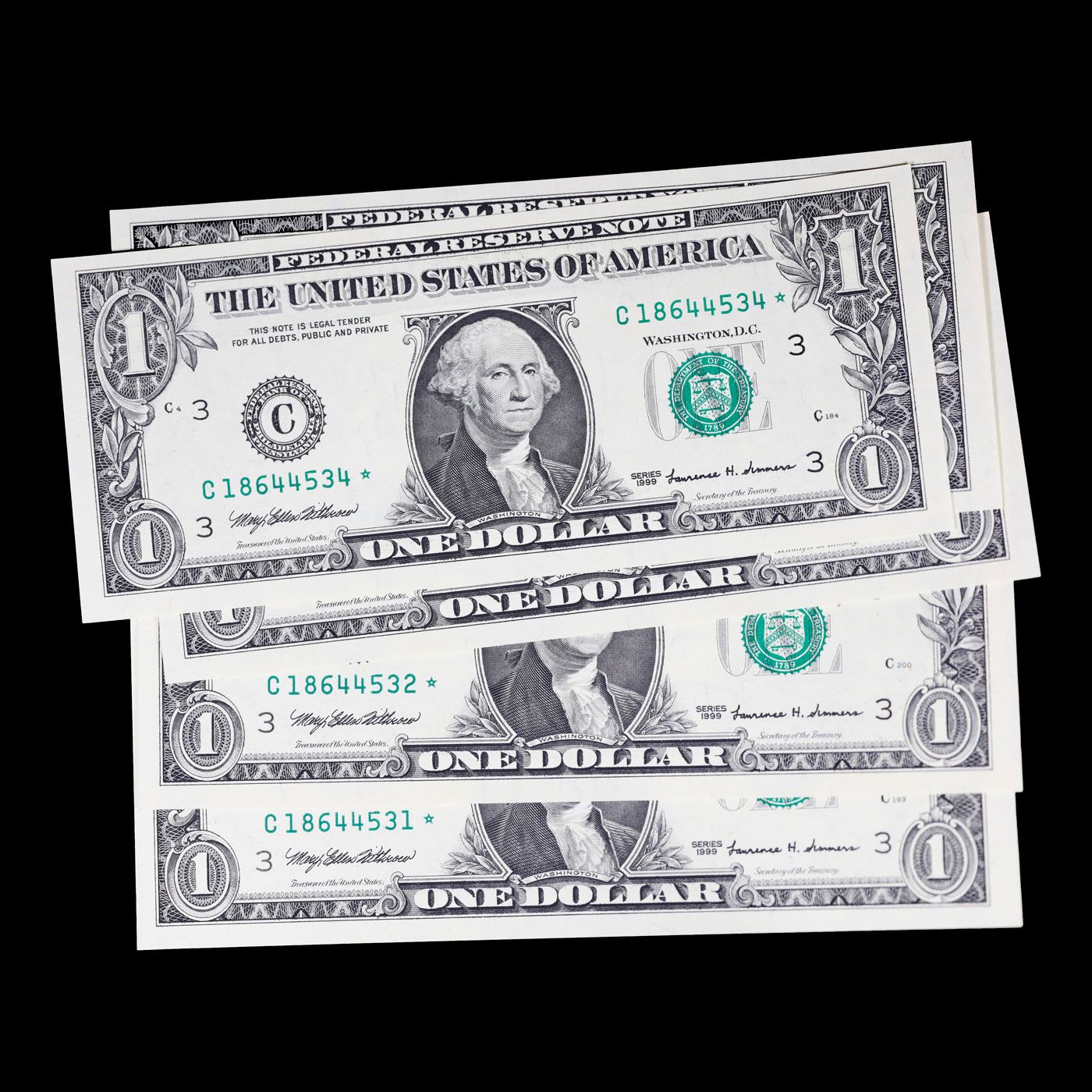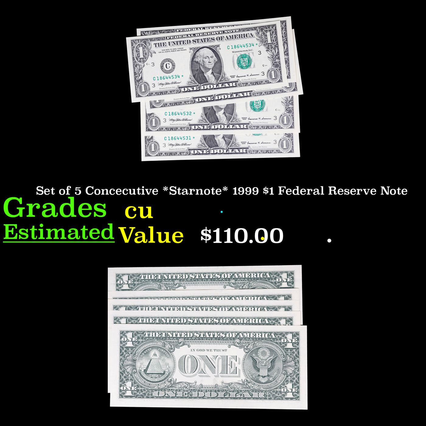 Set of 5 Concecutive *Starnote* 1999 $1 Federal Reserve Note Grades CU.