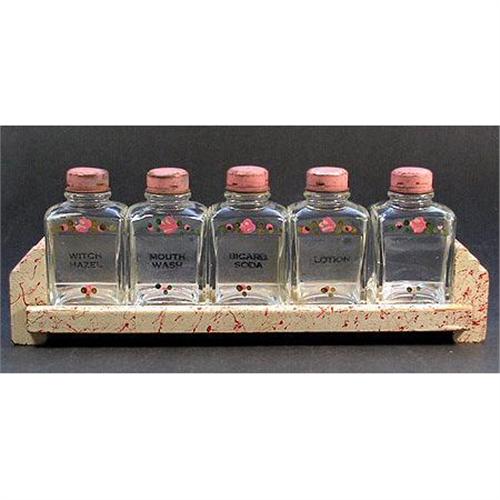 </font></strong>Set of five (5) hand painted Depression era glass lotion bottles with pink caps each marked as follows ? Lotion - Bicarb Soda - Witch Hazel - Mouth Wash and the last one was (Alcohol) but the writing is all but worn away. Bottles are decorated in tiny pink flowers. Four of the bottles retain their original cork liner in the cap. Bottles nest in their original wood tray holder. Tray measures 10 1/2 x 1 1/2 inches - each bottle measures 3 1/4 inches x 1 3/4 inches. Except for wear to the paint and lettering and wear to the pink metal caps, due to age, the entire set is in excellent condition</font>