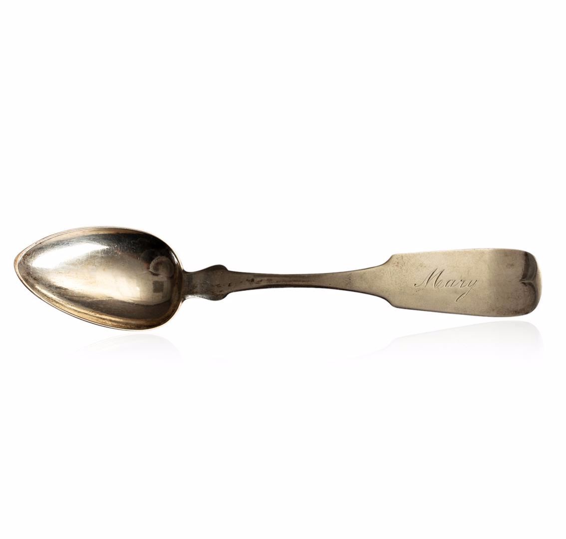 Set of 5 coin silver teaspoons in the fiddle tip pattern by James Annin, NY. 1850-1880 Engraved "Mary" in ornate period script. Excellent original condition no repairs.