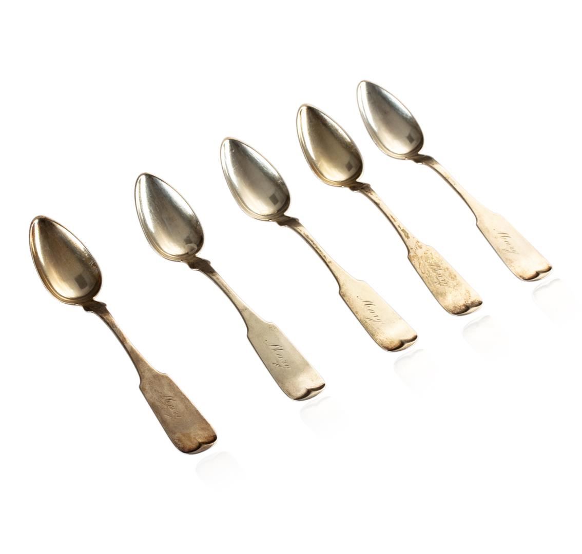 Set of 5 coin silver teaspoons in the fiddle tip pattern by James Annin, NY. 1850-1880 Engraved "Mary" in ornate period script. Excellent original condition no repairs.