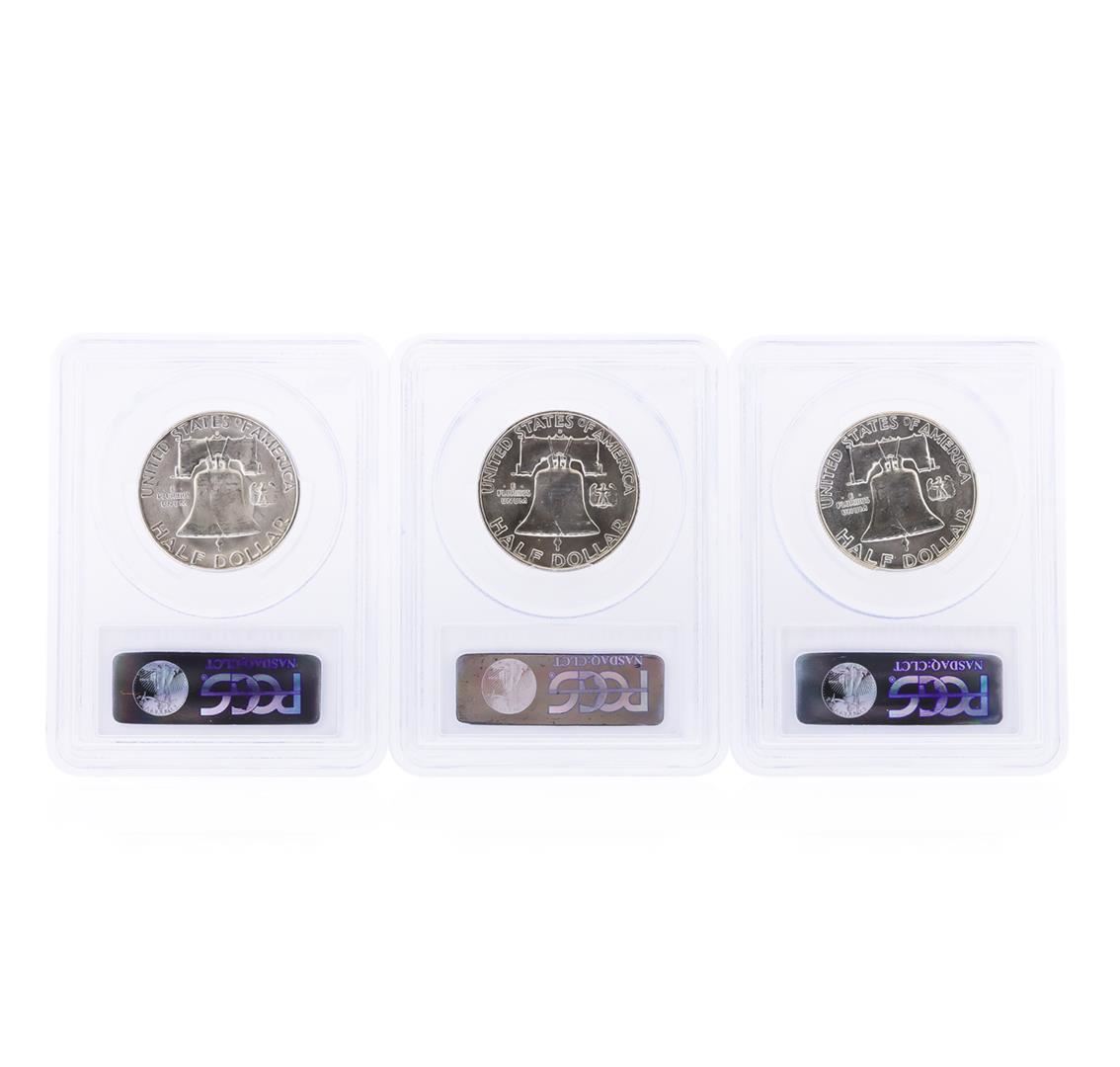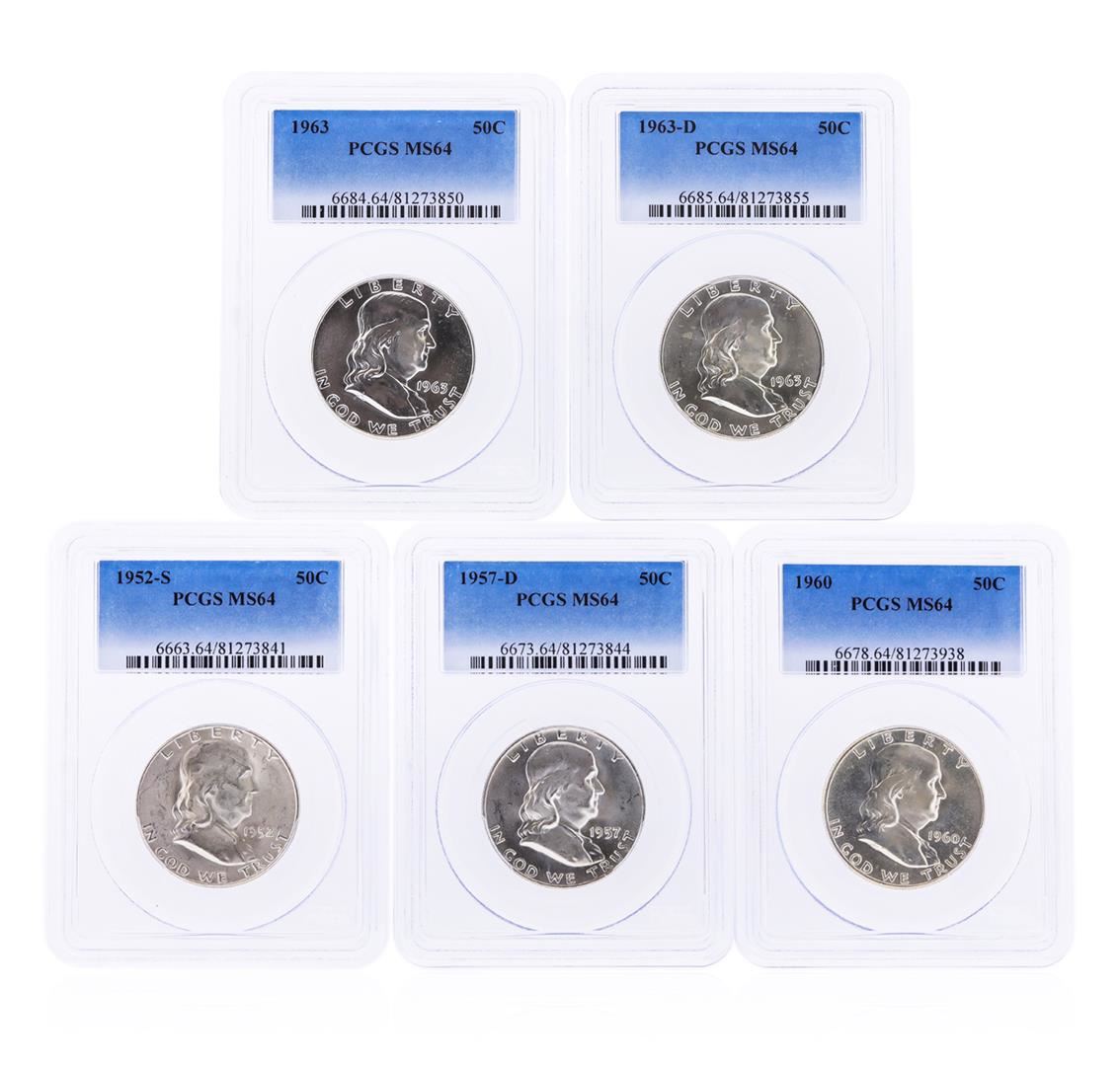 Set of (5) Franklin Half Dollar PCGS Graded Coins which includes the following (3) coins: (1) 1952-S Franklin Half Dollar PCGS Graded MS64, (1) 1957-D Franklin Half Dollar PCGS Graded MS64, (1) 1960 Franklin Half Dollar PCGS Graded MS64, (1) 1963 Franklin PCGS Graded.