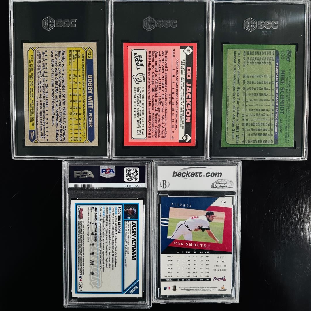 This five-card group features a blend of legends, prospects, and Hall of Famers across multiple decades. Included are a 1987 Topps Bobby Witt #615 graded SGC 3, a 1986 Topps Traded Bo Jackson #50T graded SGC 7, and a 1982 Topps Mike Schmidt #100 graded SGC 7. Rounding out the lot are a 2007 Bowman Chrome Draft Picks & Prospects Jason Heyward #BDPP54 graded PSA 5 and a 1998 Pinnacle Performers #62 John Smoltz graded BCCG 10. A solid mix of vintage and modern stars in professionally graded slabs.